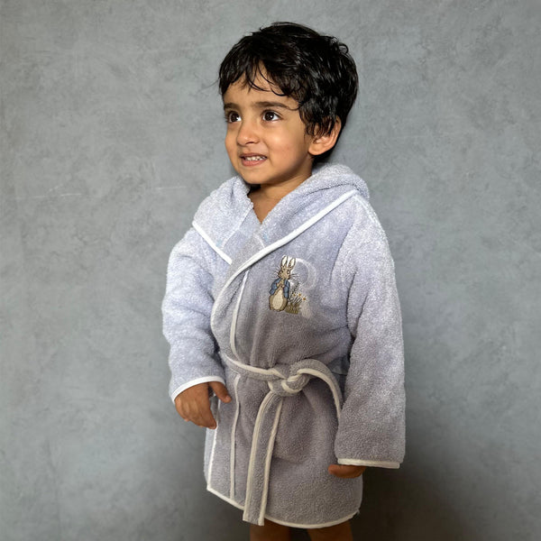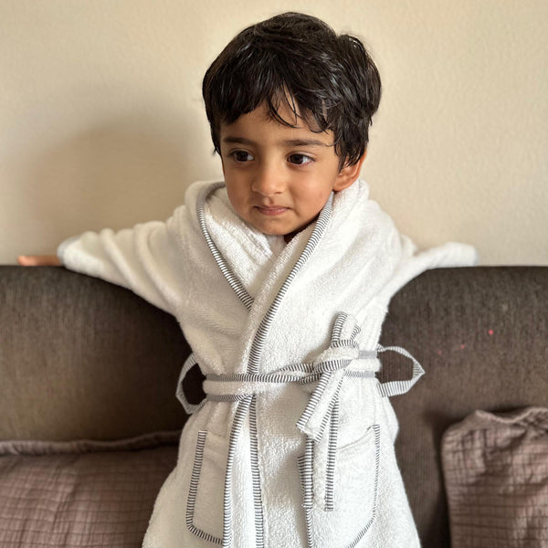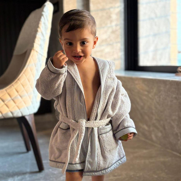 A soothing sage green bathrobe with striped trims, designed for a relaxing and calming bath time experience. The gentle color and ultra-soft texture make it a favorite for both parents and babies.