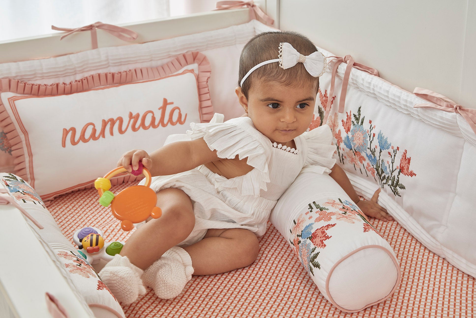 A floral fantasy for your little one, the Blossom Crib Set is a vision of soft pastels, intricate floral embroidery, and timeless elegance. Designed to provide the utmost comfort, this set features a fitted sheet, a plush quilted comforter, padded cot bumpers, and delicately embroidered cushions. The perfect blend of beauty and functionality, this set transforms any nursery into a dreamy garden escape.