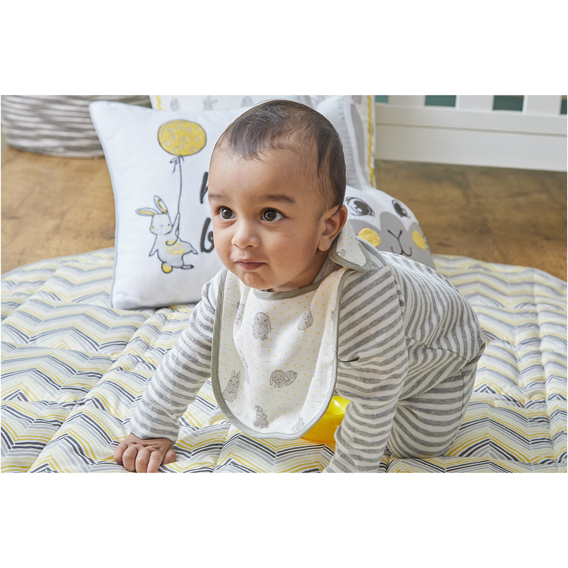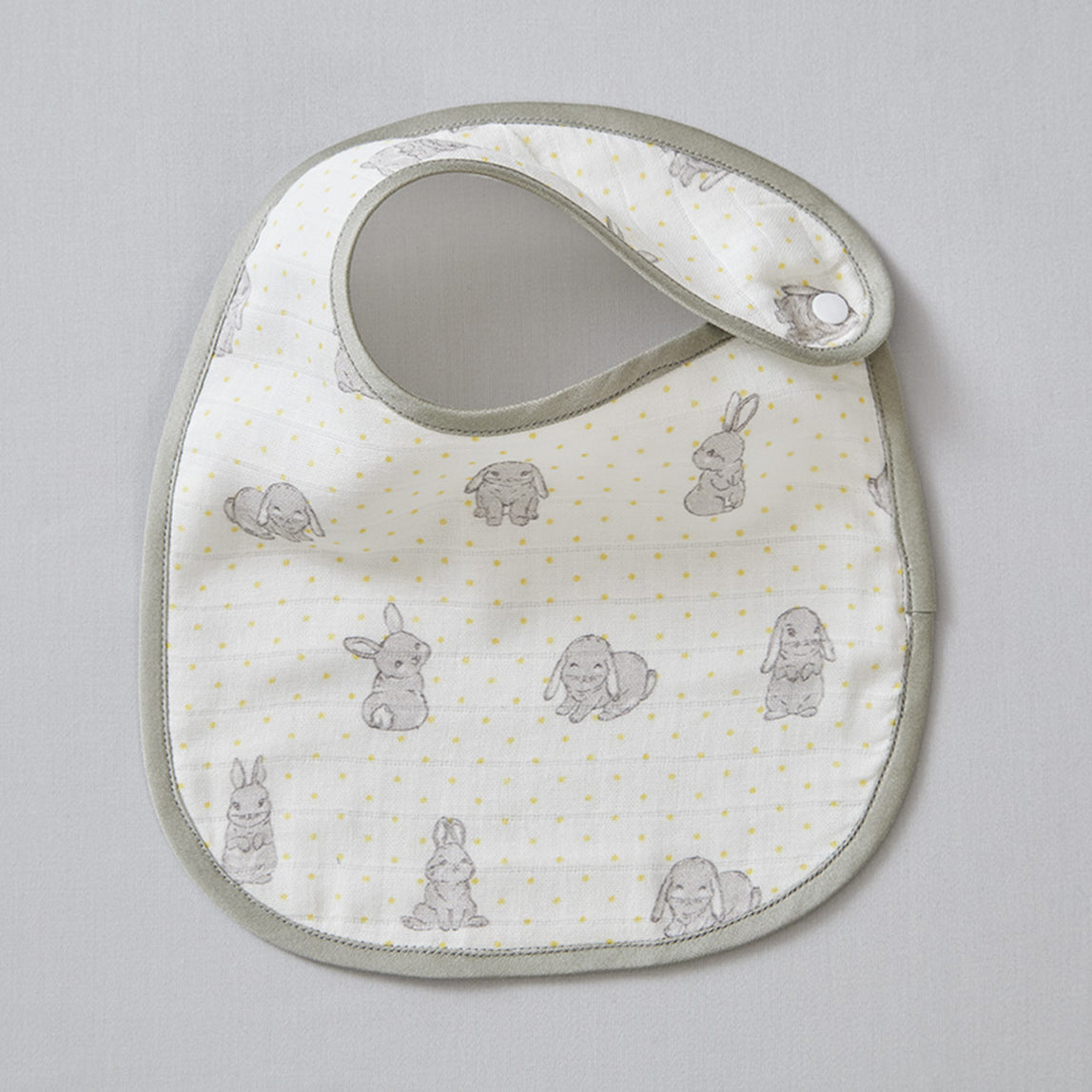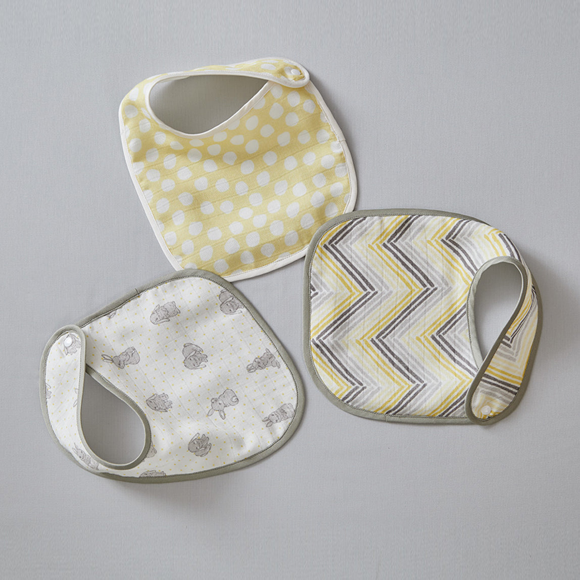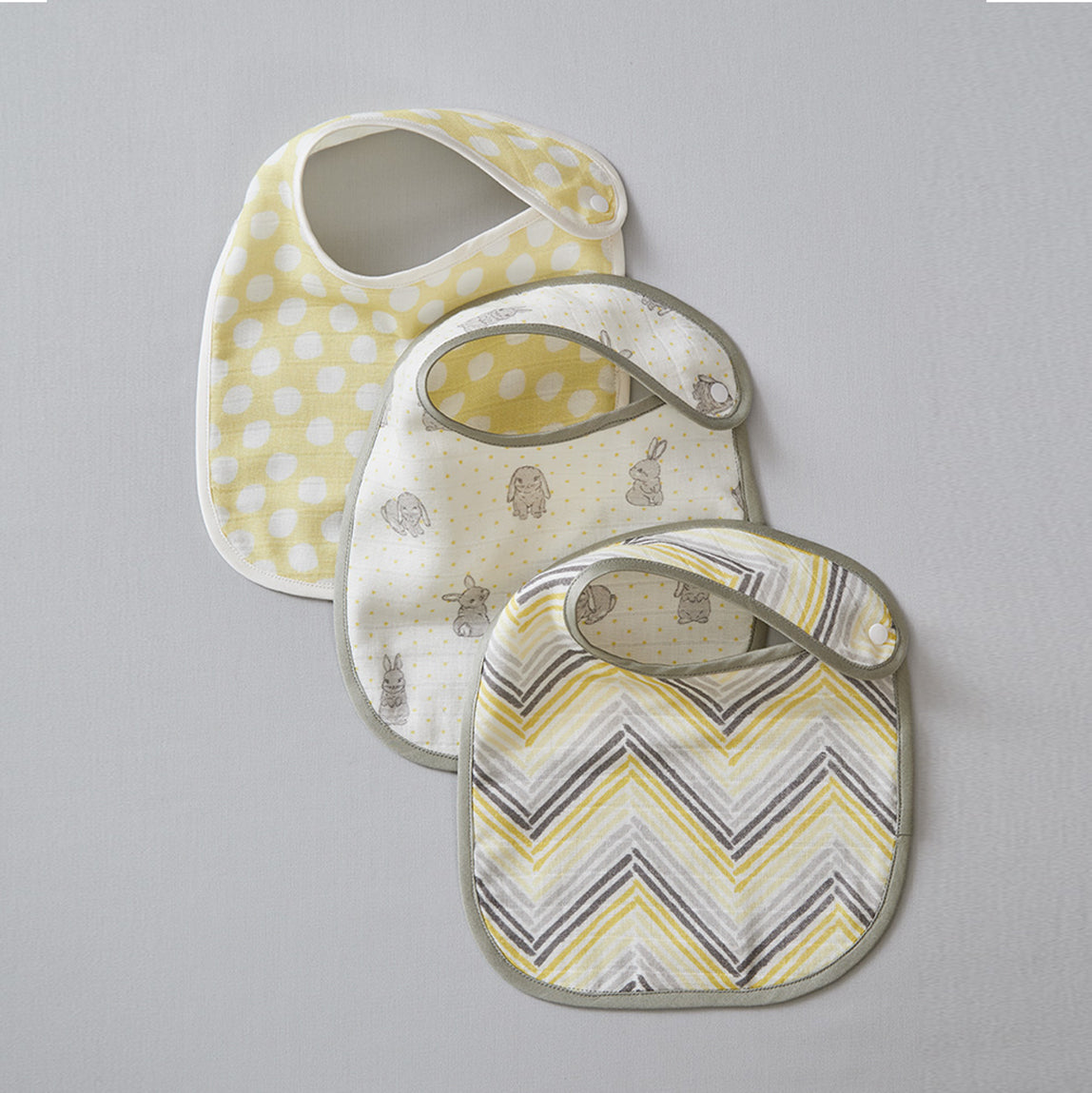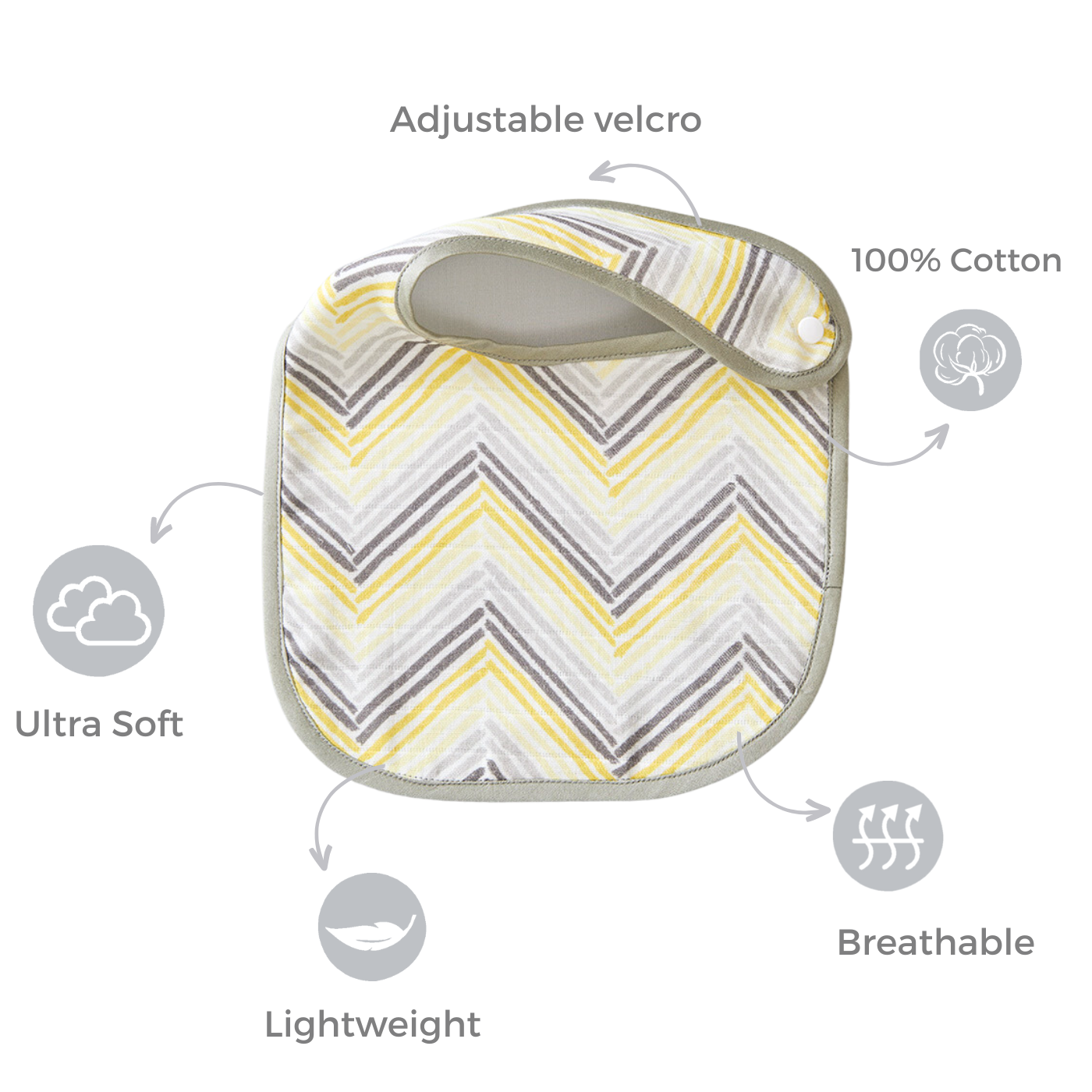 Featuring cheerful bunny prints, yellow chevrons, and polka dots, these muslin bibs offer absorbent comfort with adjustable velcro closures for a perfect fit every time.