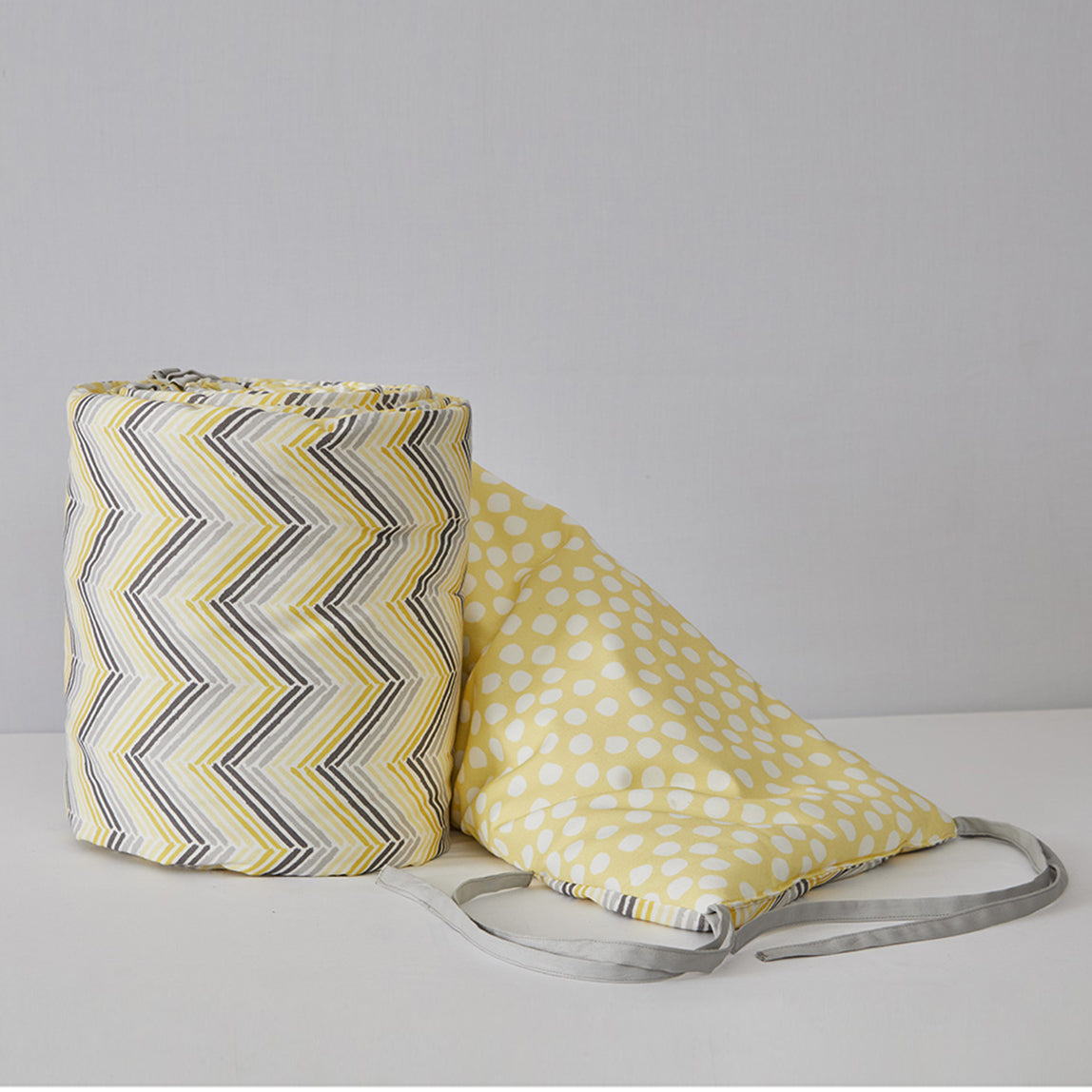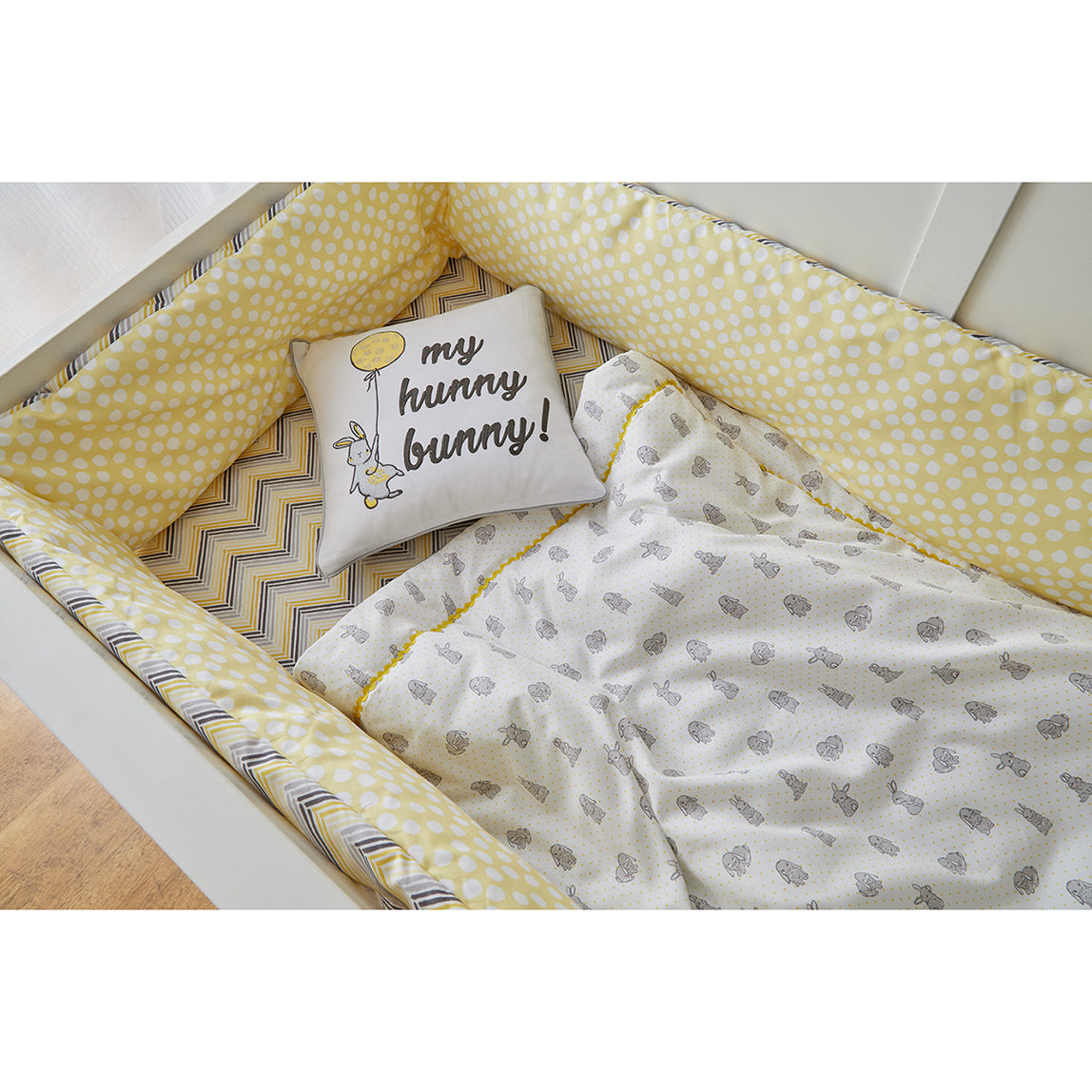 The Bunny Cot Bumper brings a playful, cheerful vibe with soft yellow hues and bunny prints. Crafted from premium cotton with thick padding, it protects little ones while adding a cozy touch to the crib. The inner wadding and quilted design ensure gentle cushioning while maintaining breathability.