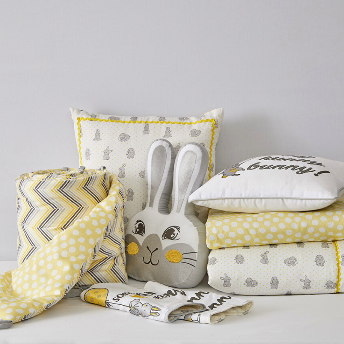 Soft, cozy, and irresistibly cute, the Bunny Crib Set is perfect for a dreamy nursery. With delicate yellow and white hues, playful bunny prints, and chevron-patterned accents, this bedding creates a cheerful yet calming space. The set includes a fitted sheet, plush comforter, padded cot bumpers, and adorable bunny-shaped cushions, making it an ideal choice for snuggles and sweet dreams.