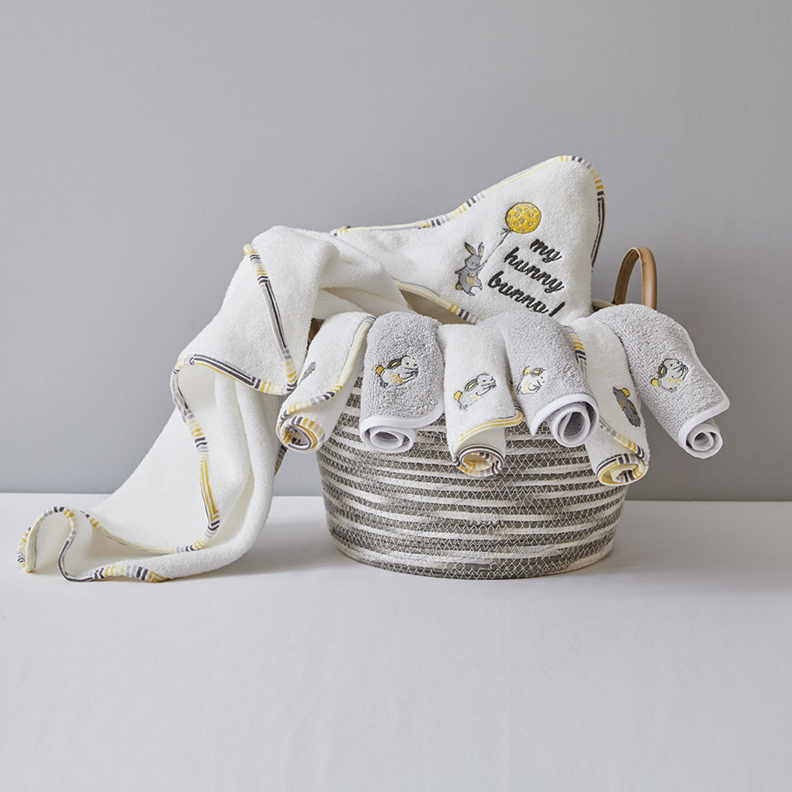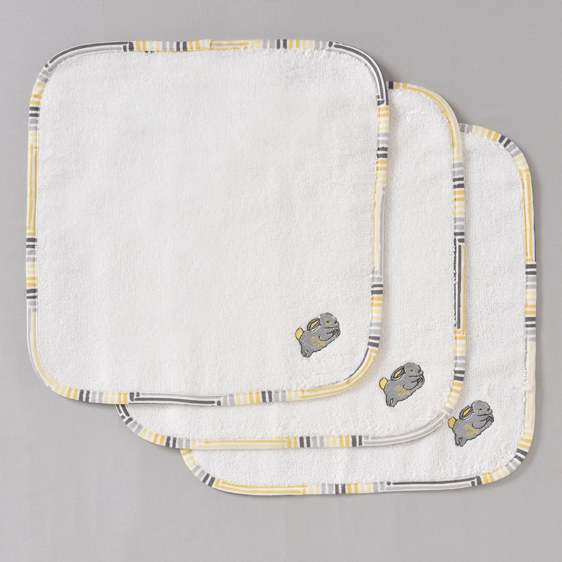 The Bunny Face Towel Set offers three ultra-soft towels with adorable bunny embroidery and cheerful yellow piping. Made from plush zero-twist terry cotton, they’re absorbent, gentle, and durable for daily clean-ups.