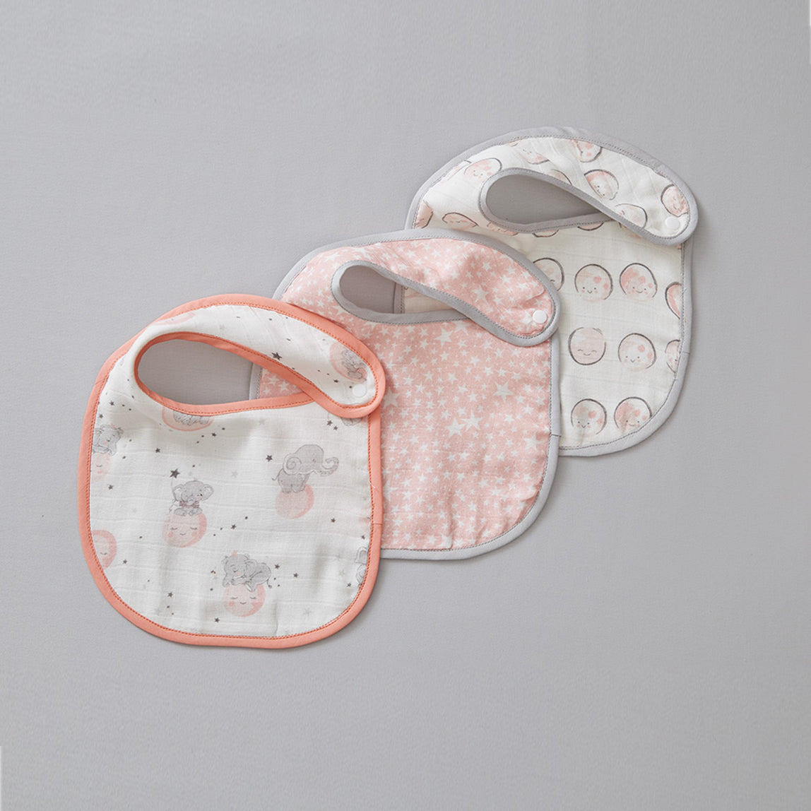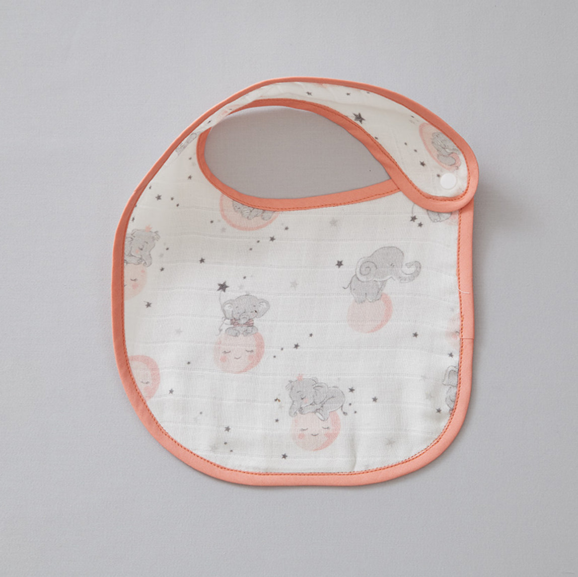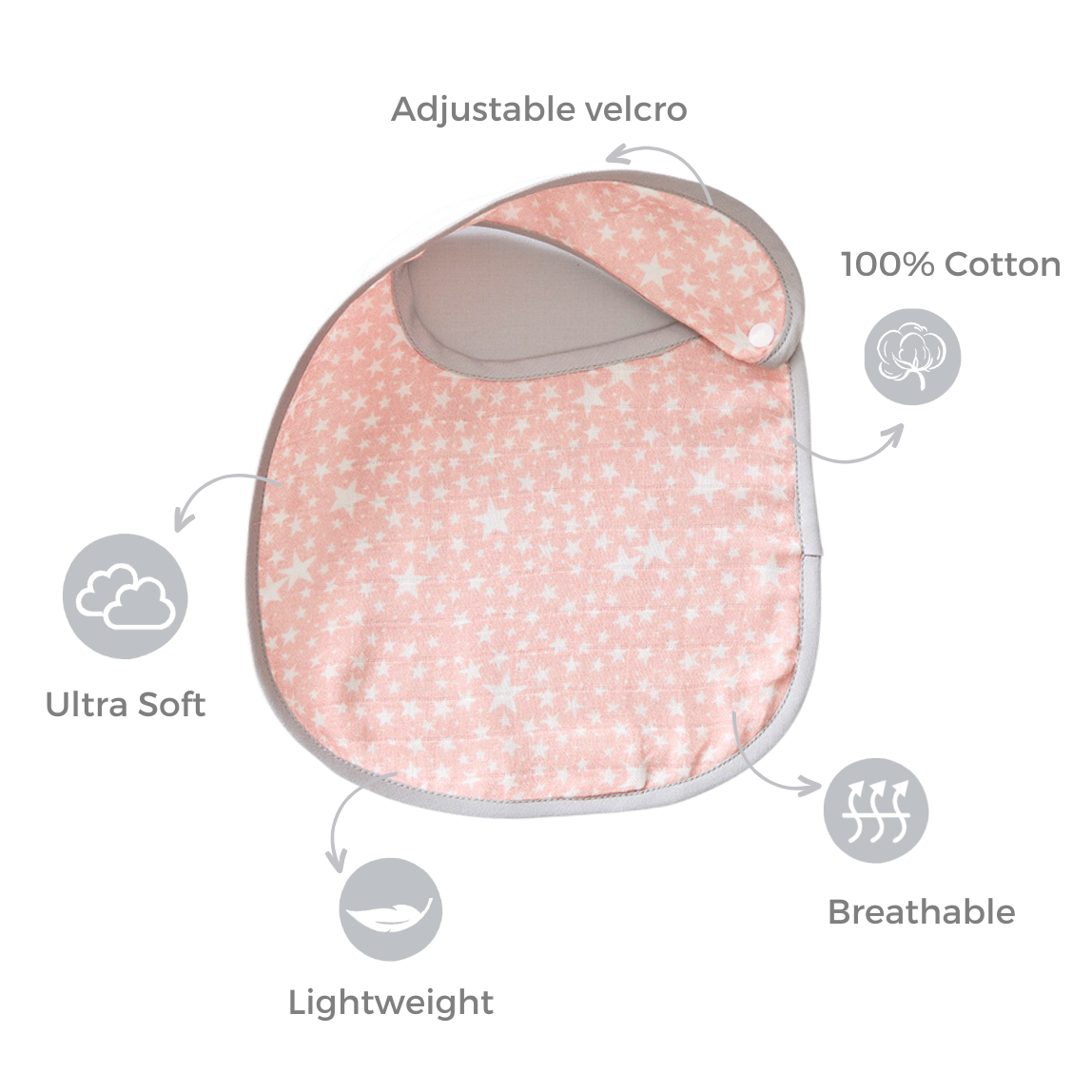 Adorable bibs with pink elephant prints, stars, and moons. The muslin cotton is soft and absorbent, while the adjustable velcro straps make feeding time fuss-free.