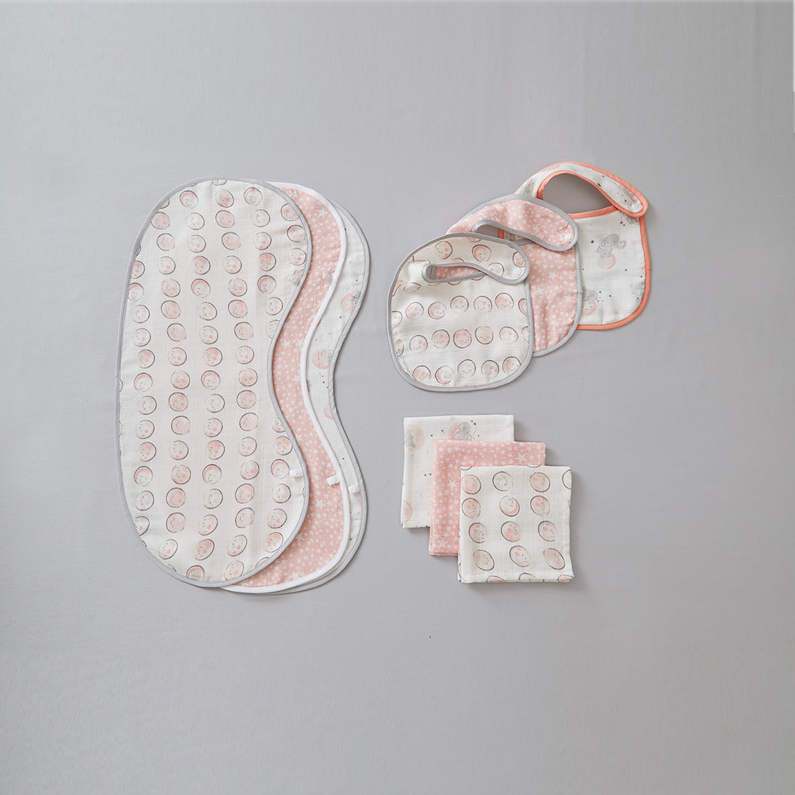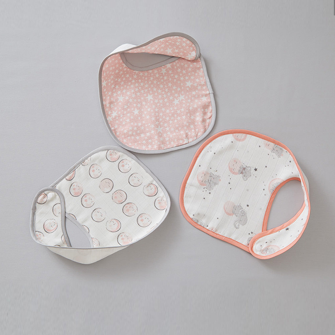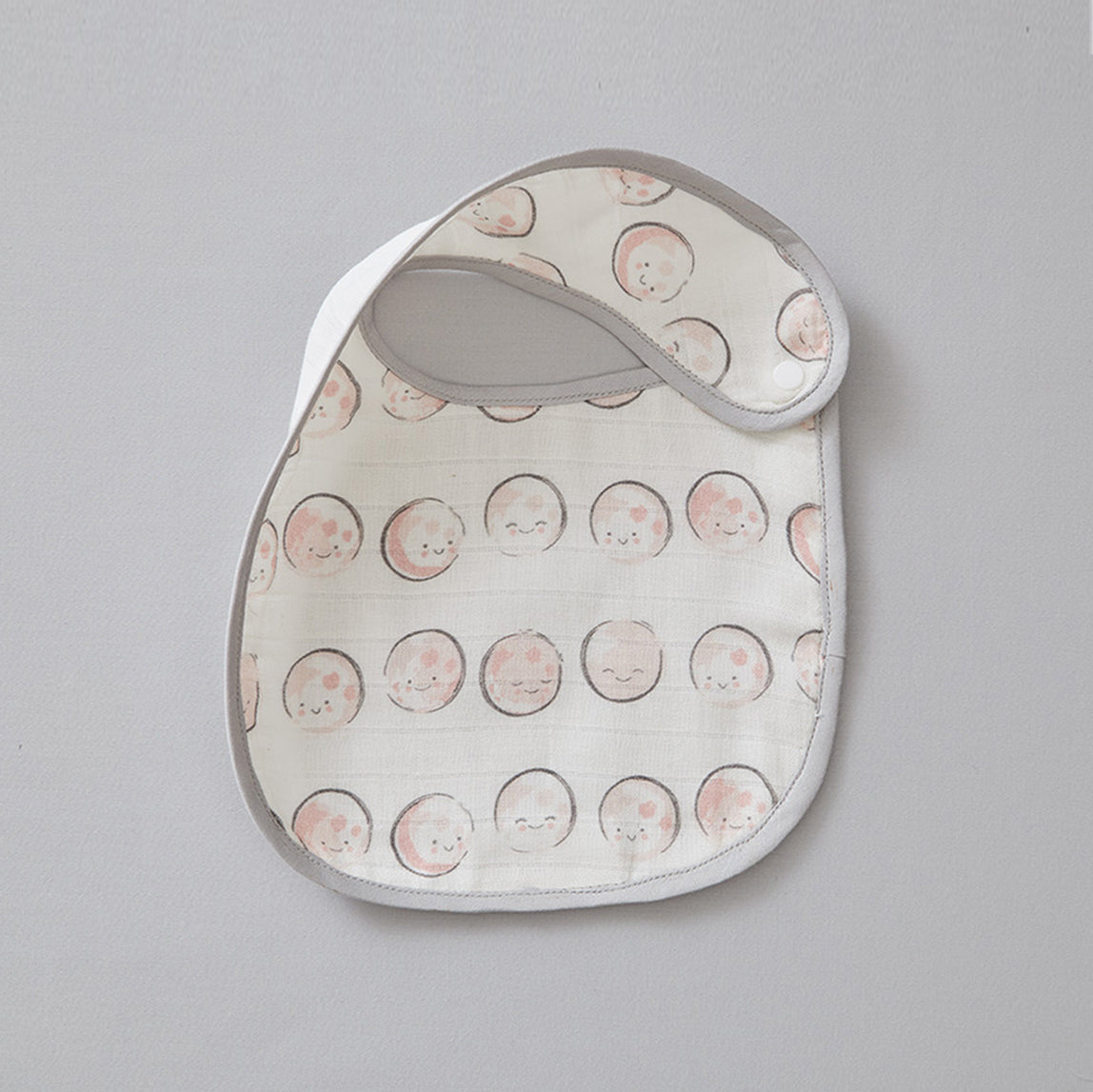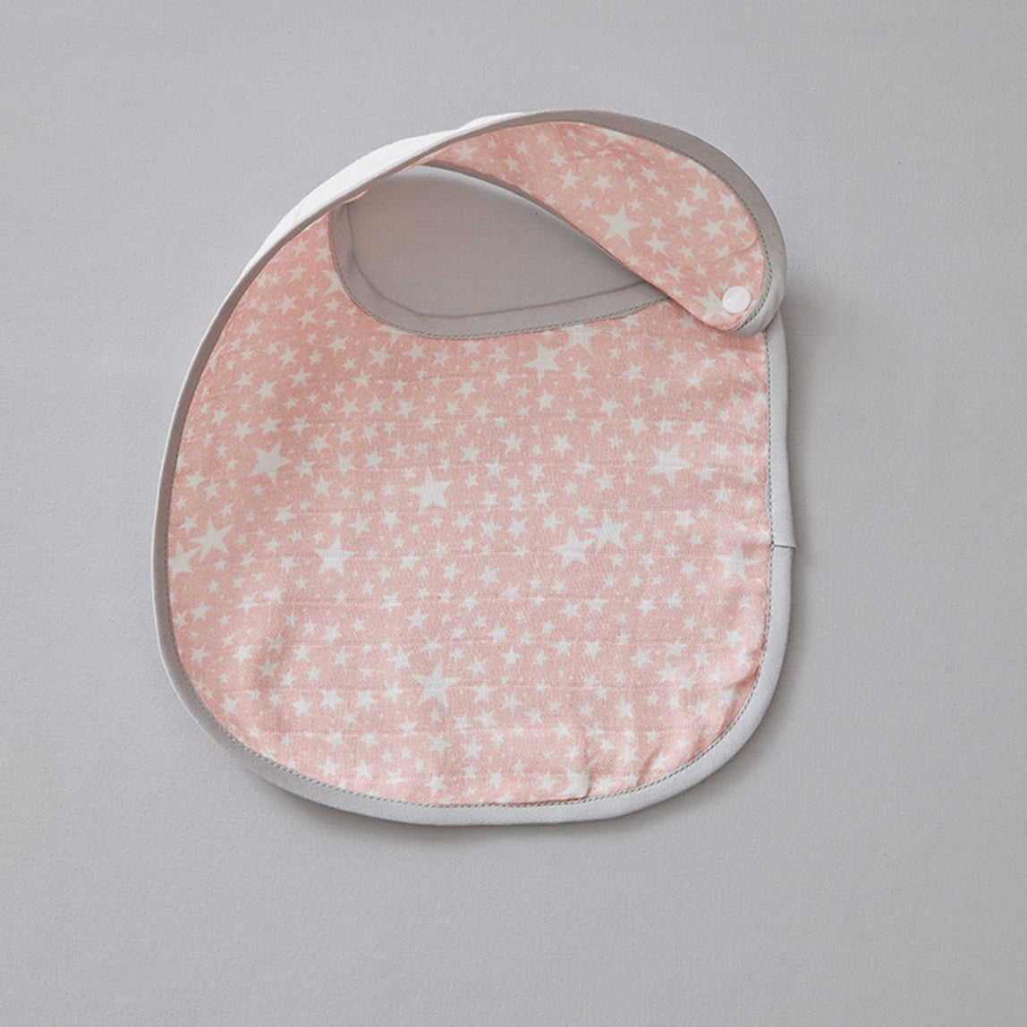Adorable bibs with pink elephant prints, stars, and moons. The muslin cotton is soft and absorbent, while the adjustable velcro straps make feeding time fuss-free.
