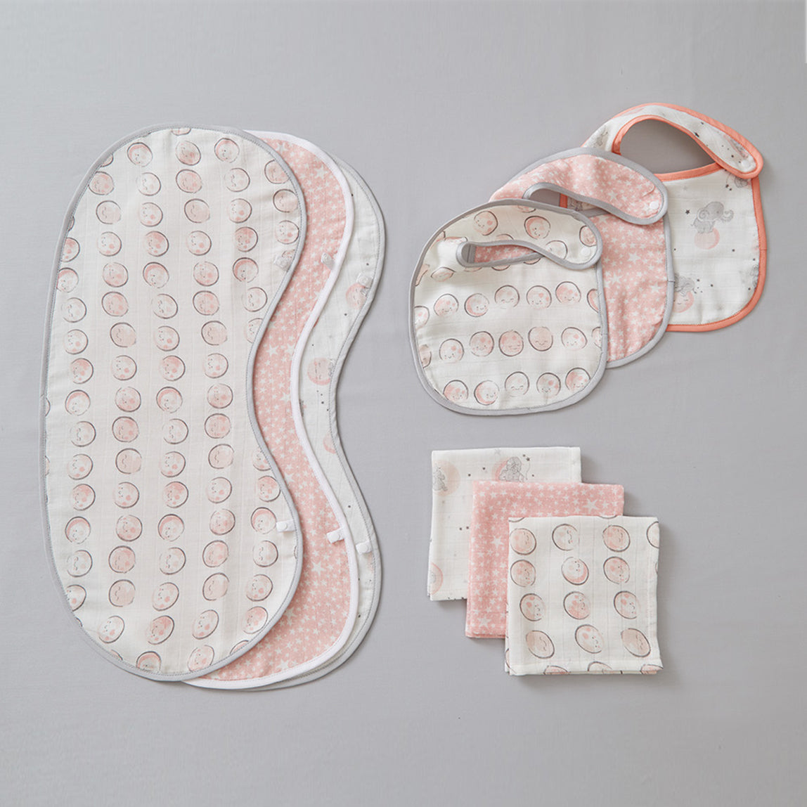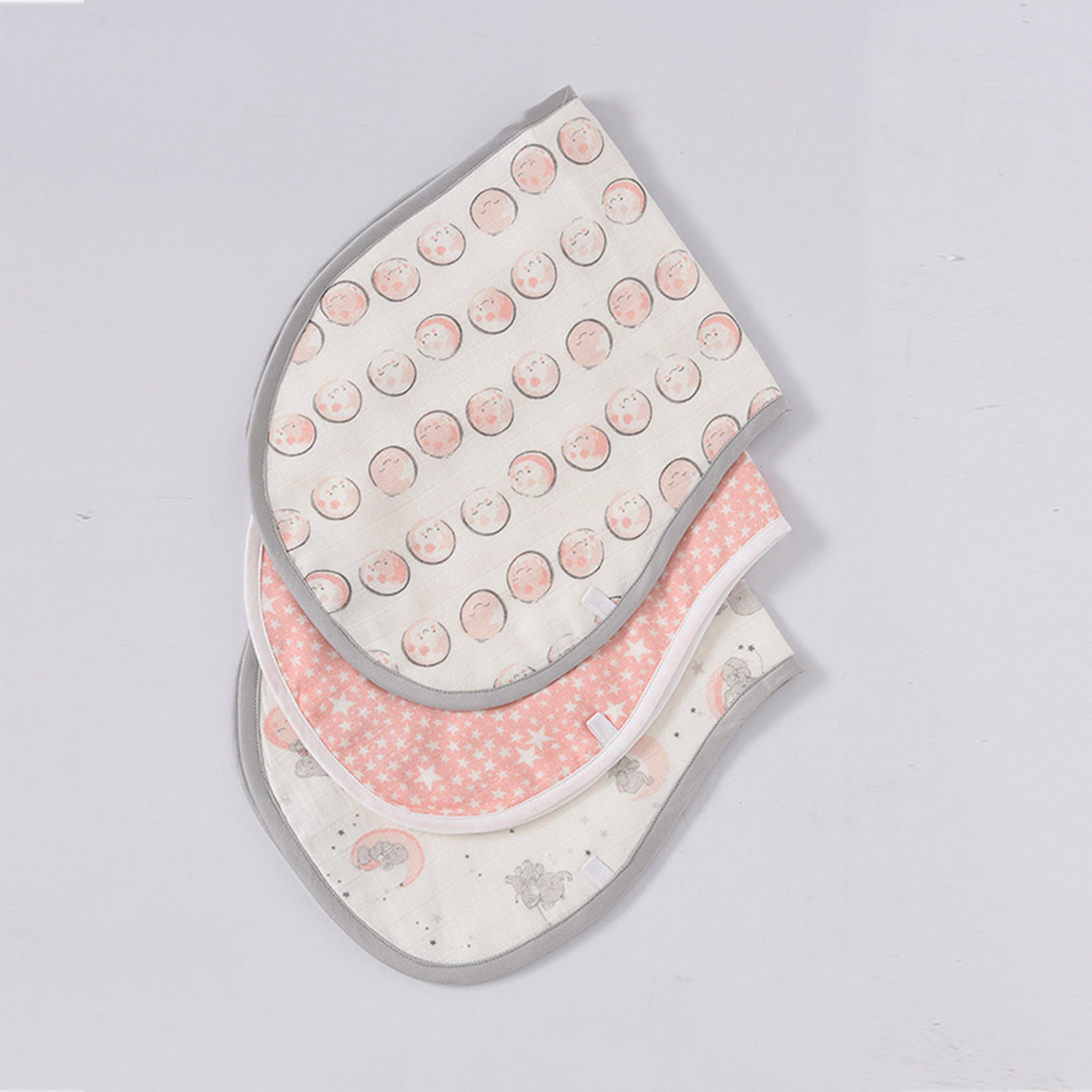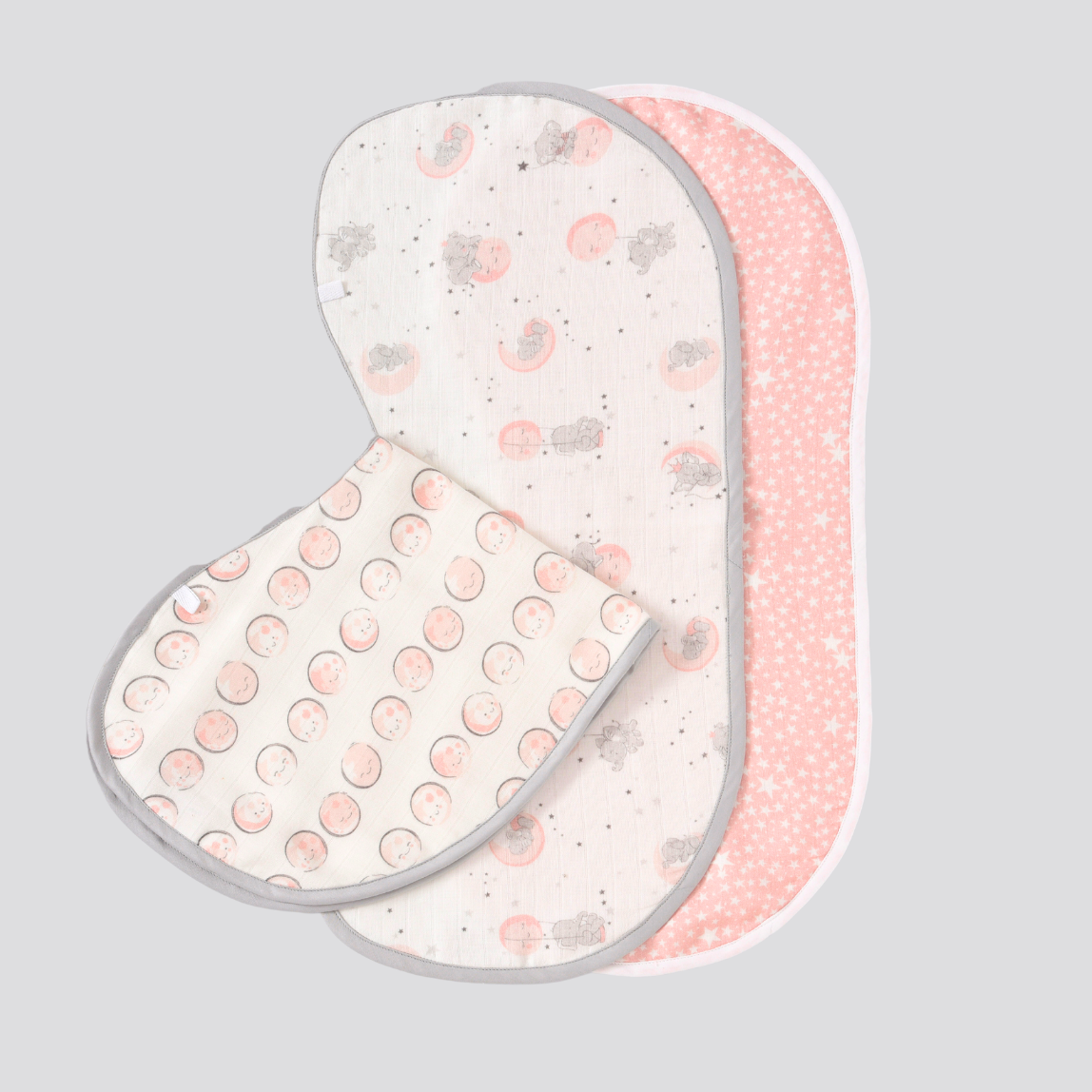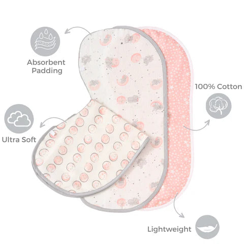 Featuring sweet moon and elephant prints in pastel pink, these burp cloths are made from absorbent muslin cotton that's gentle on baby's skin. Ideal for burping, wiping, or as a handy on-the-go accessory.