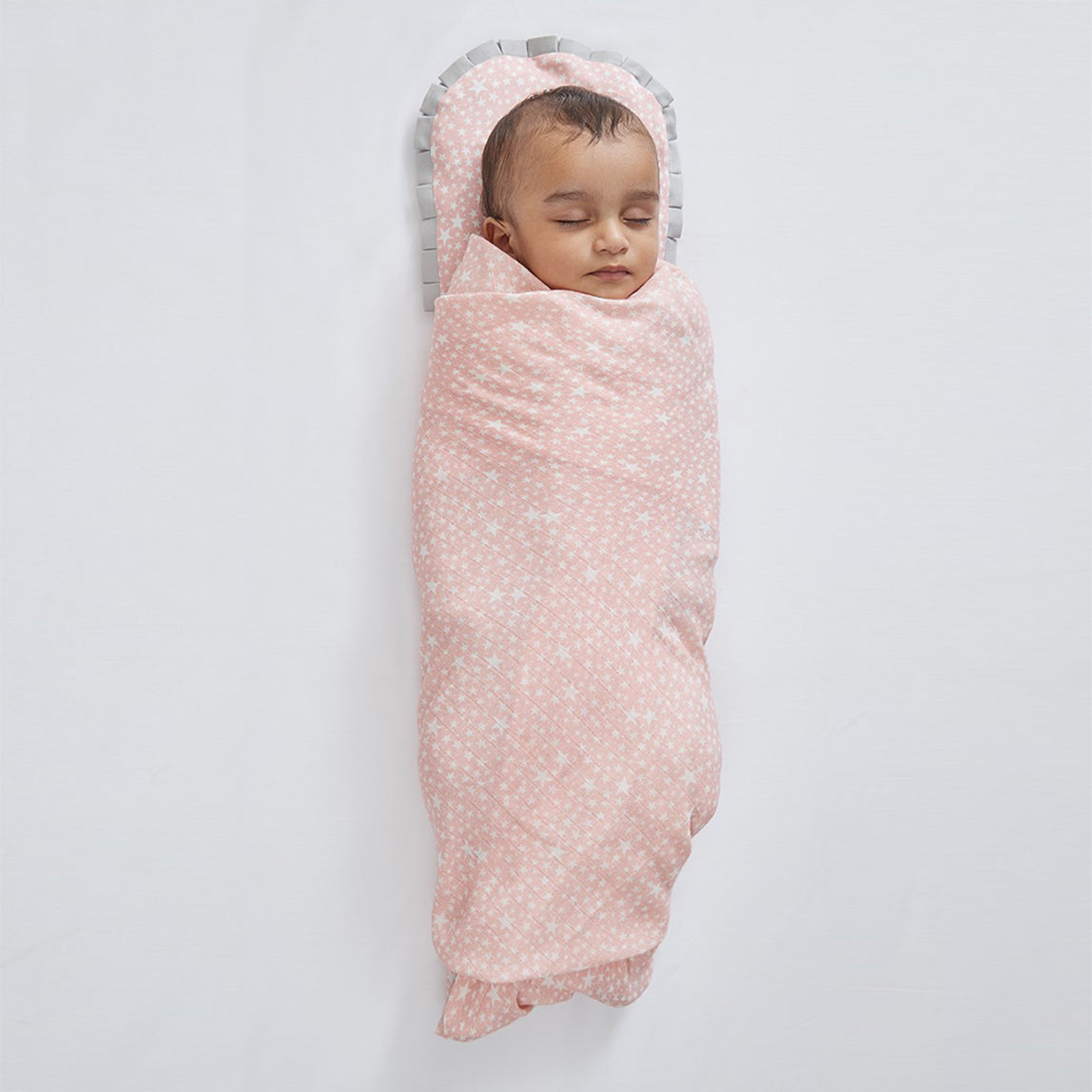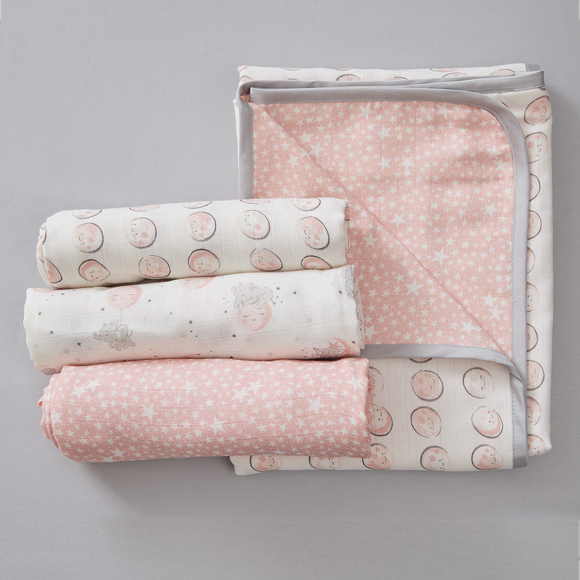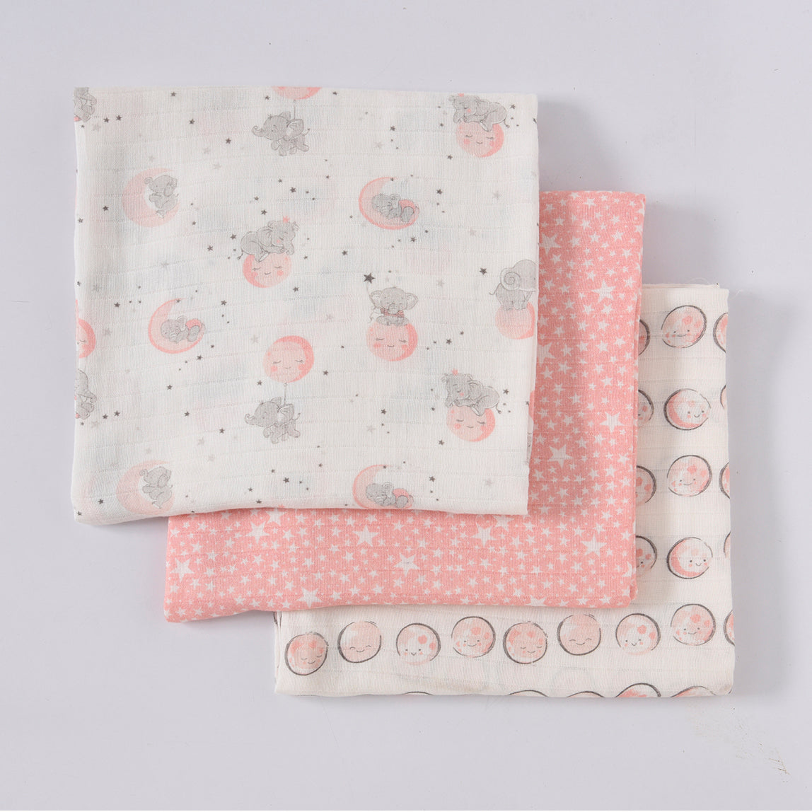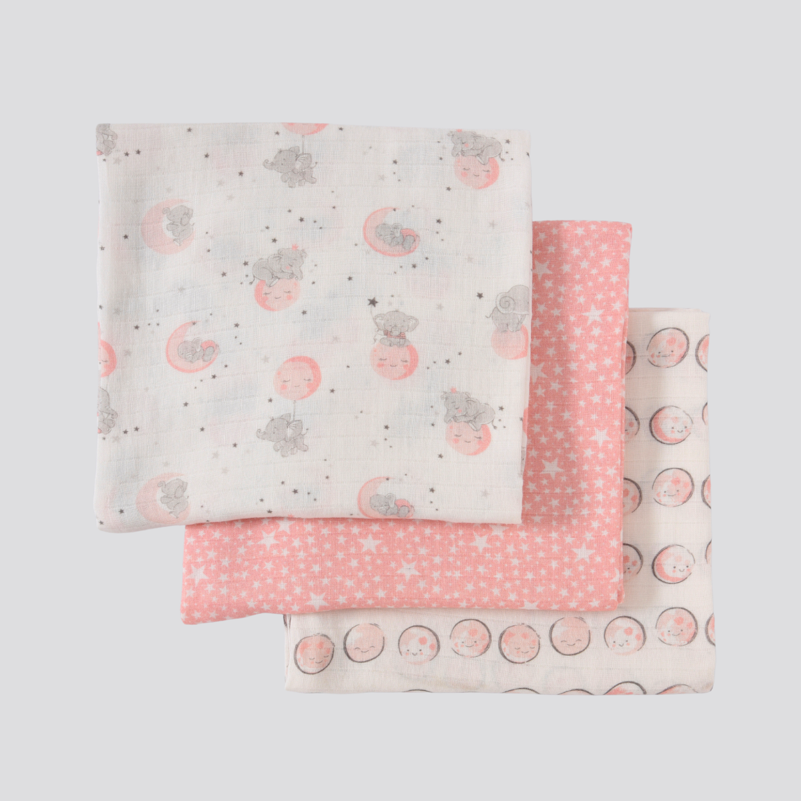 These muslin swaddles feature charming elephant and moon prints in soft pink tones, complemented by tiny star accents. Made from breathable cotton muslin that allows for optimal airflow, ensuring warmth without overheating. Versatile and gentle, they're great for swaddling, burping, or as a light blanket.