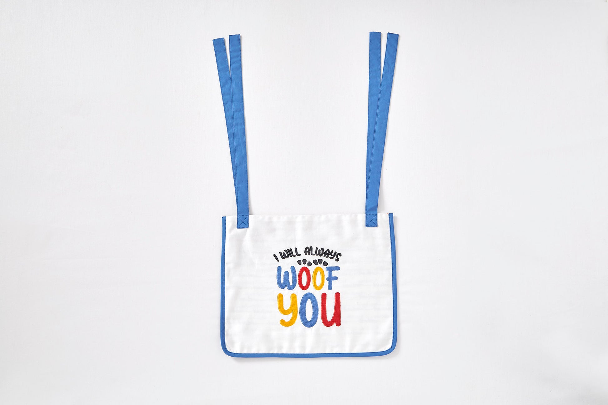 Bright and fun with a dog embroidery and 'I Will Always Woof You' message. Practical and spacious. Contrasting blue trim brings a playful pop of color.