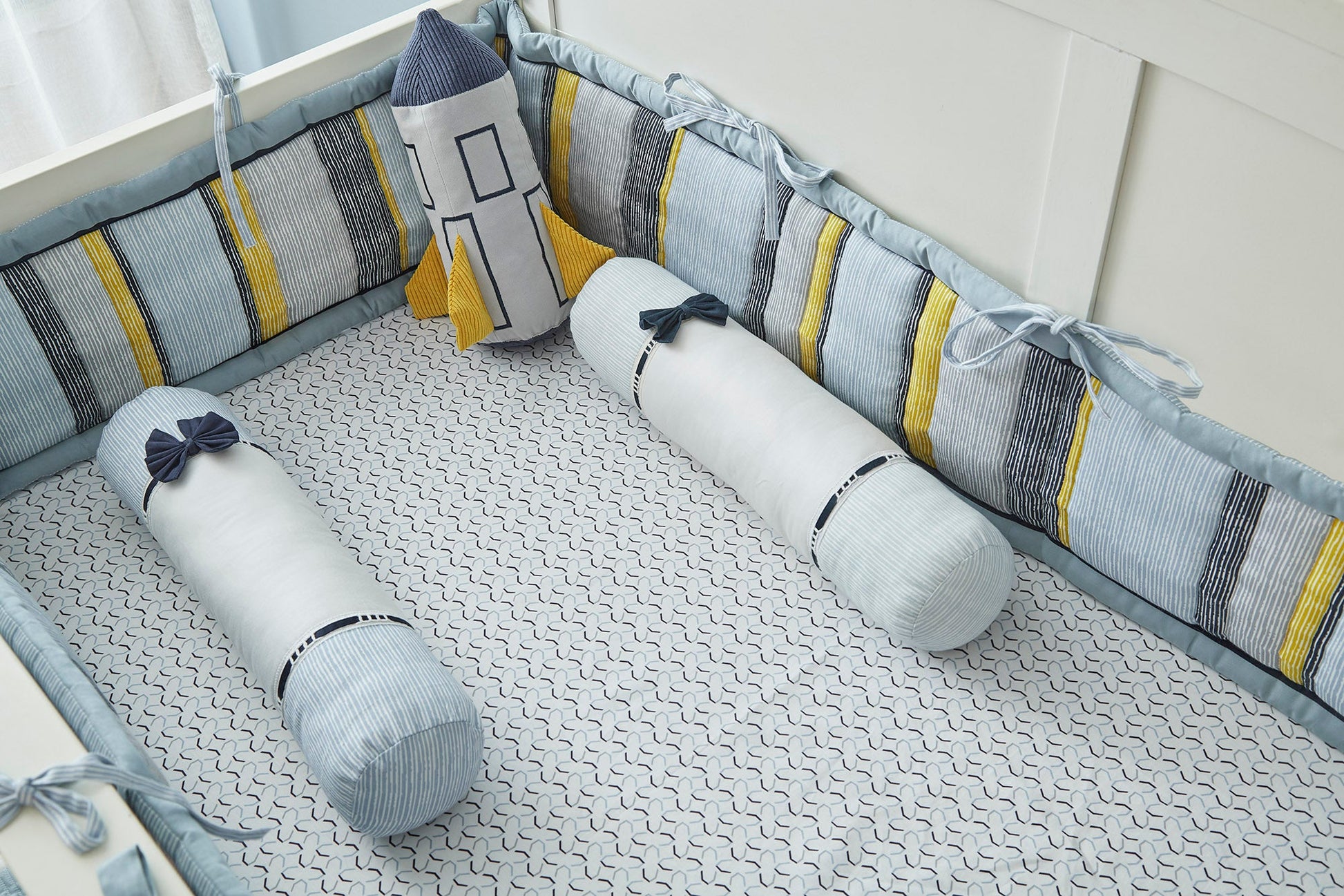 Classic and refined, the Odyssey Bolster Set adds a sophisticated touch to the nursery. The cotton satin base is adorned with subtle navy bow detailing and pinstripe accents, creating a timeless look. These bolsters provide the perfect balance of firmness and comfort, making them ideal for tummy time or lounging. The hidden zipper allows for effortless removal and cleaning, ensuring convenience without compromising style.