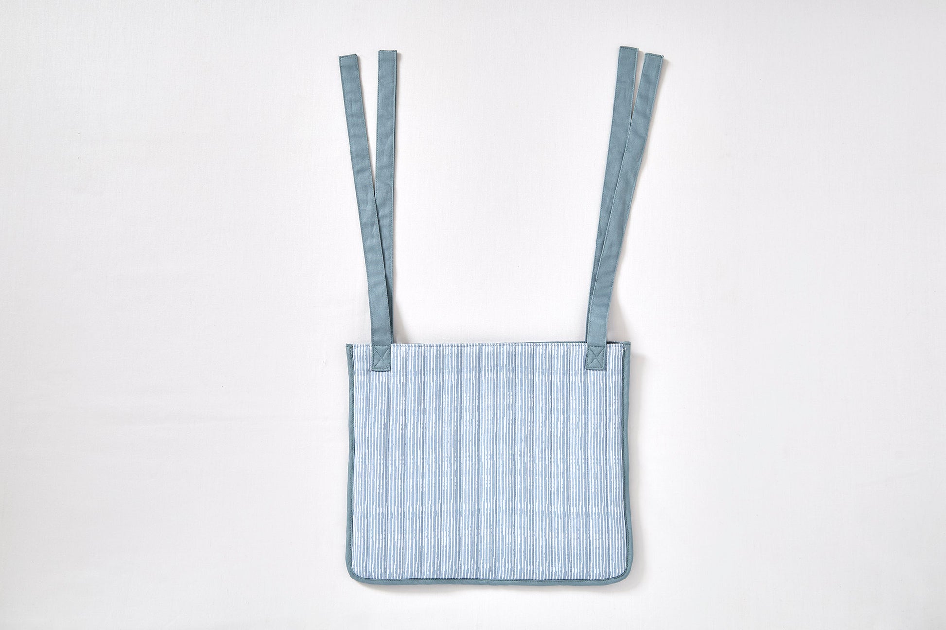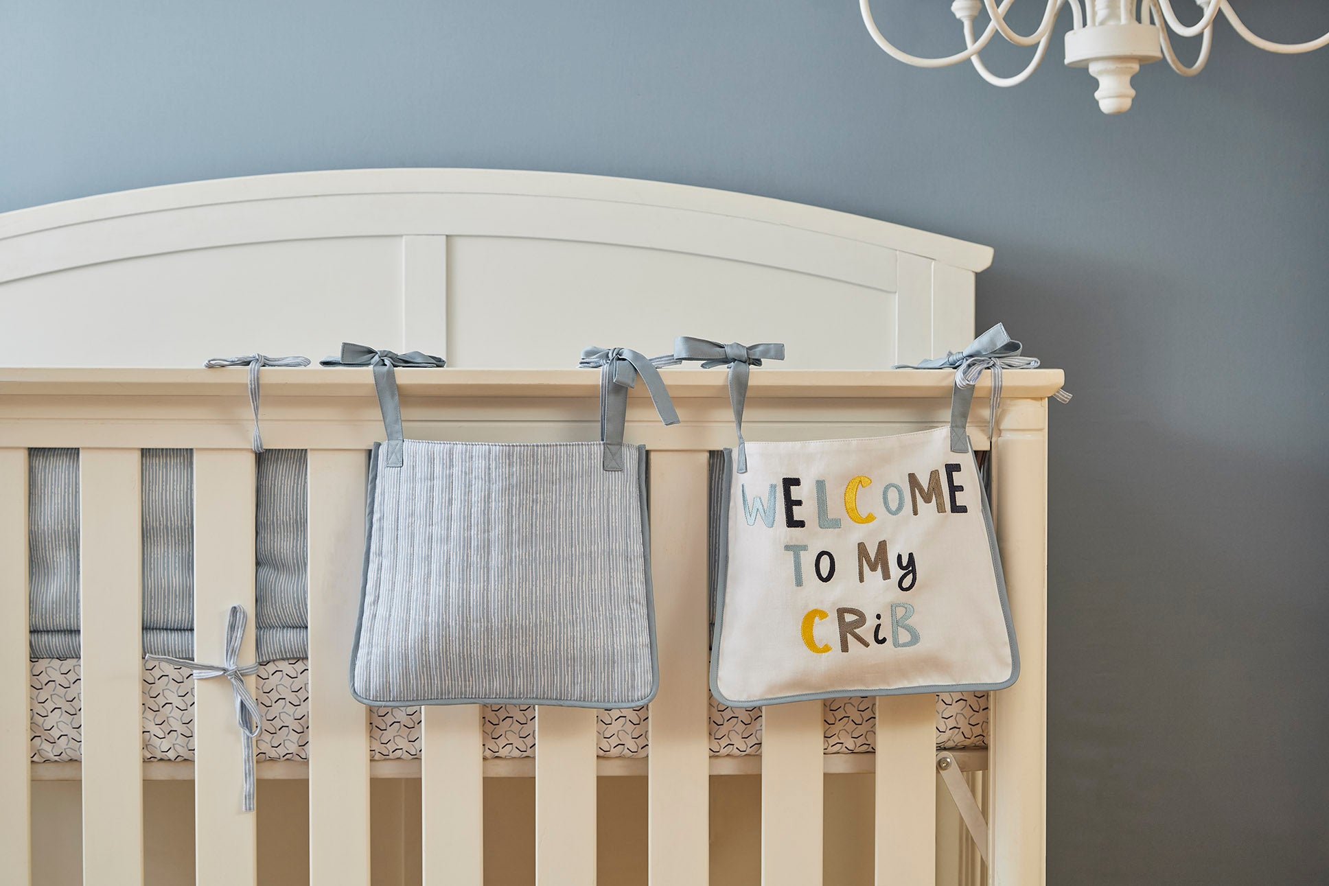 Cool blue stripes and 'Welcome to My Crib' embroidery. Roomy and stylish for everyday use. Secure ties ensure a snug fit to the crib.