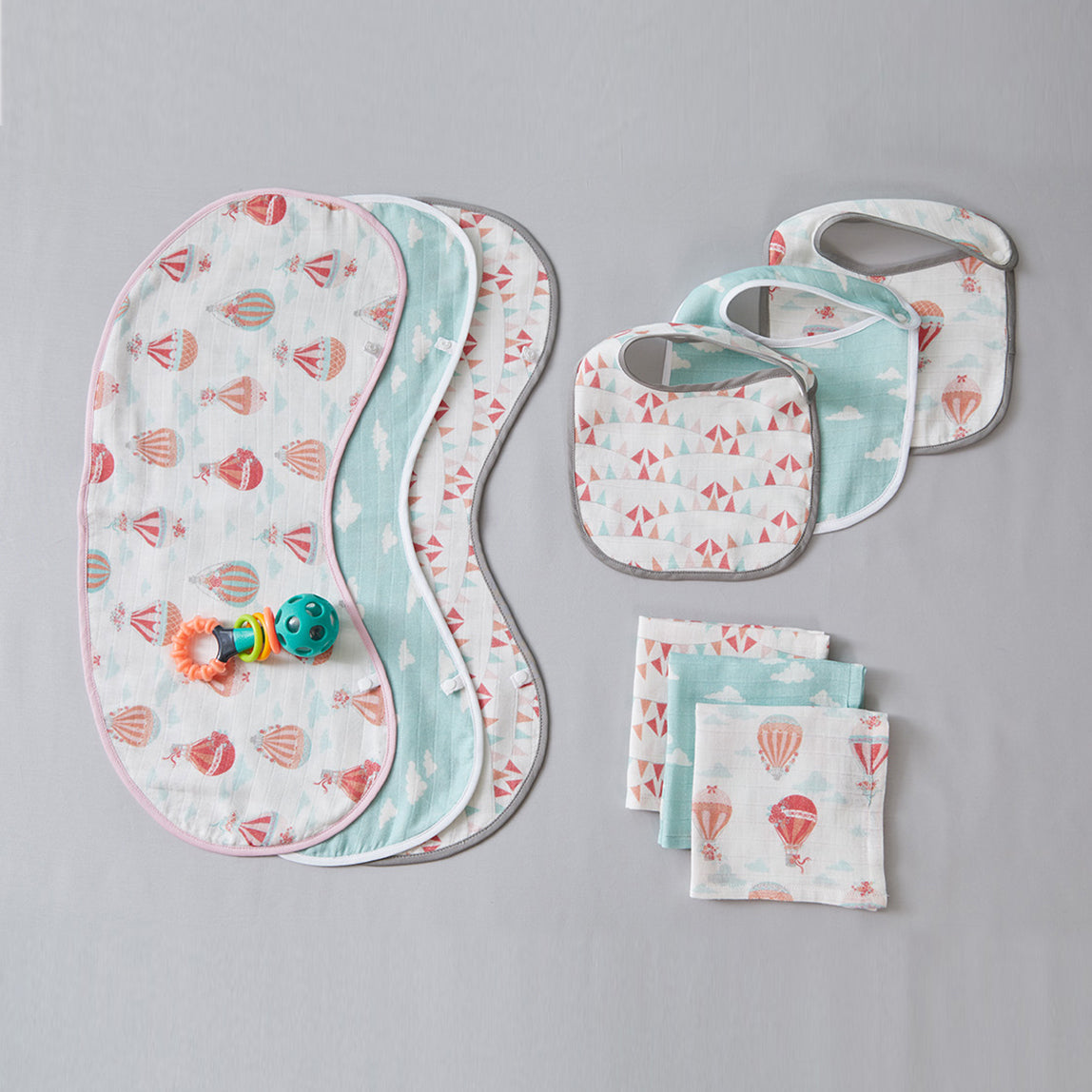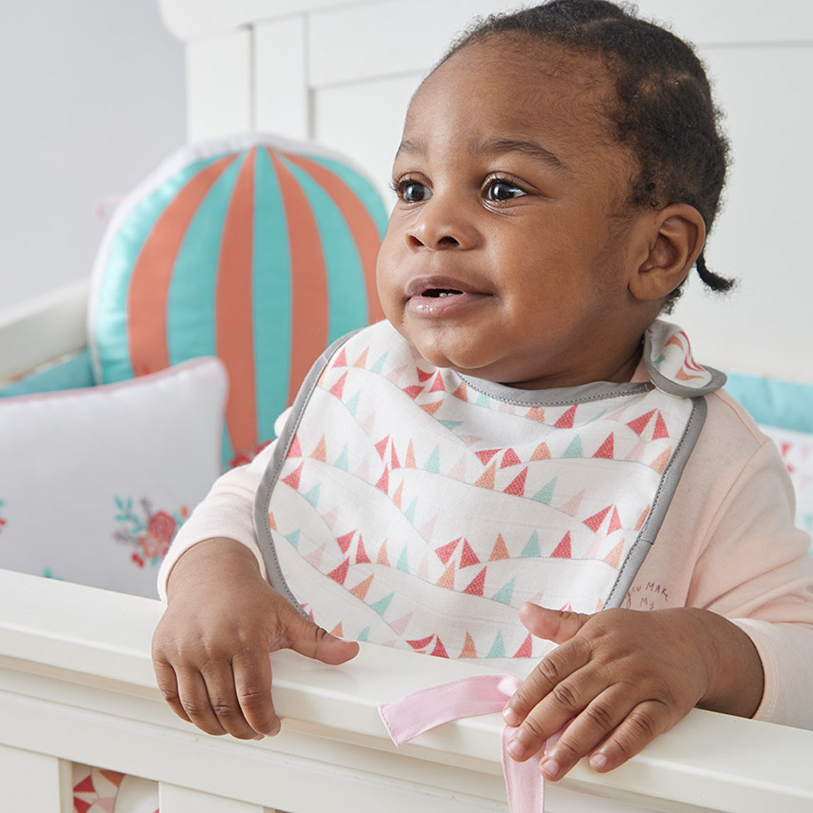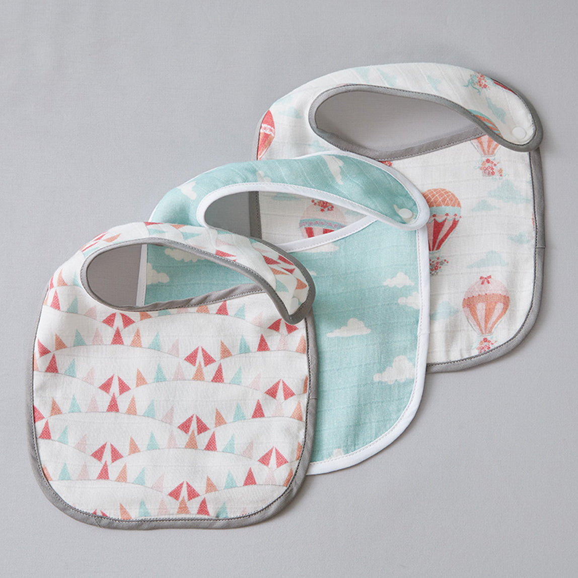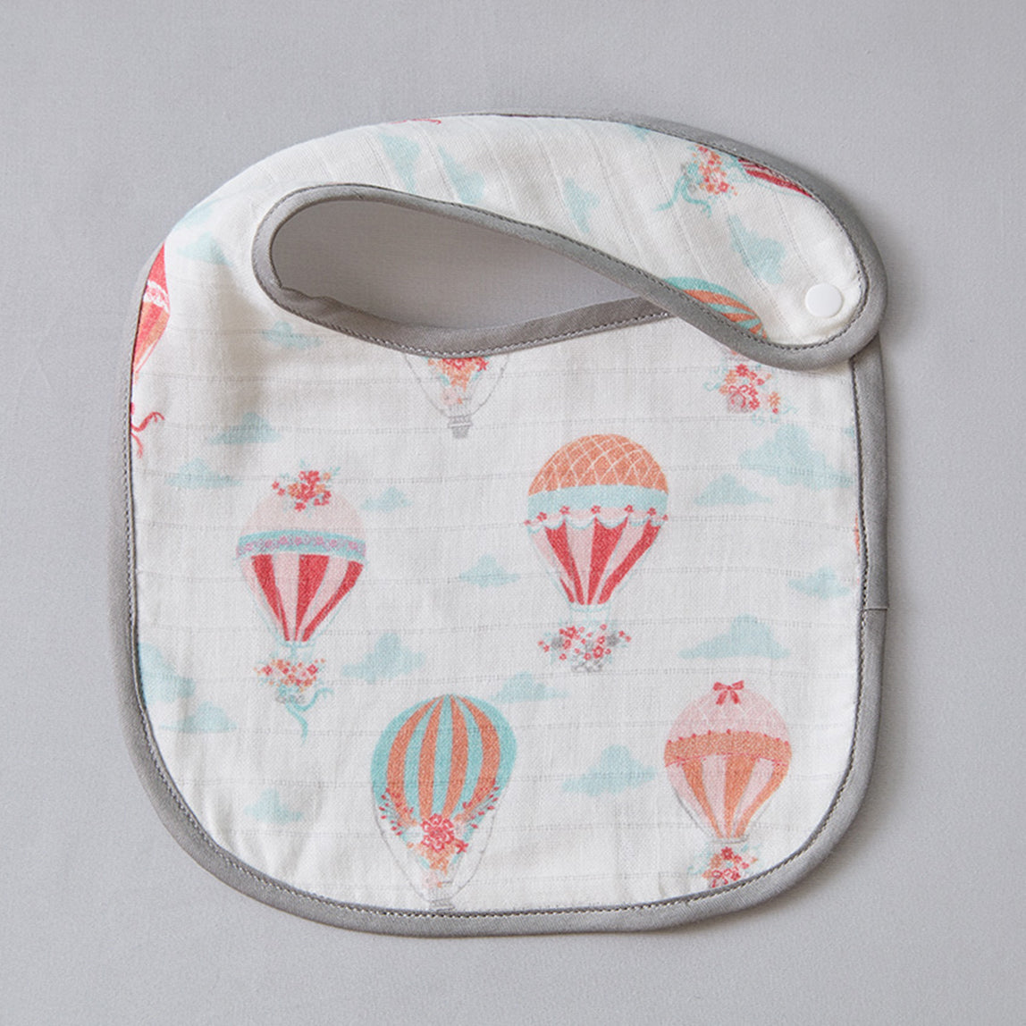 Light and airy muslin cotton bibs featuring hot air balloons, clouds, and colorful confetti dots. The adjustable velcro closure provides a secure fit, while the breathable fabric keeps little ones cool and comfy.