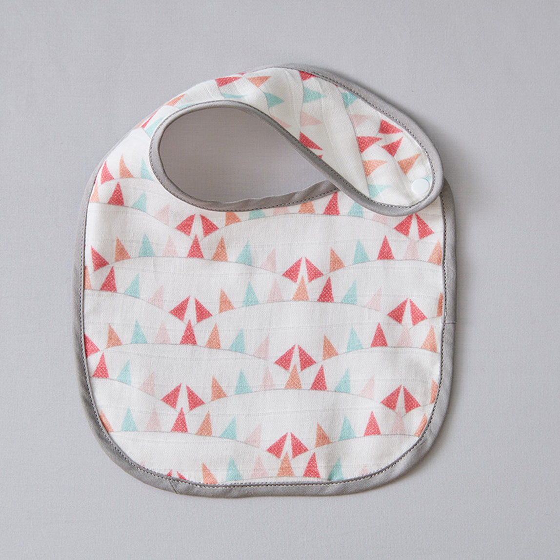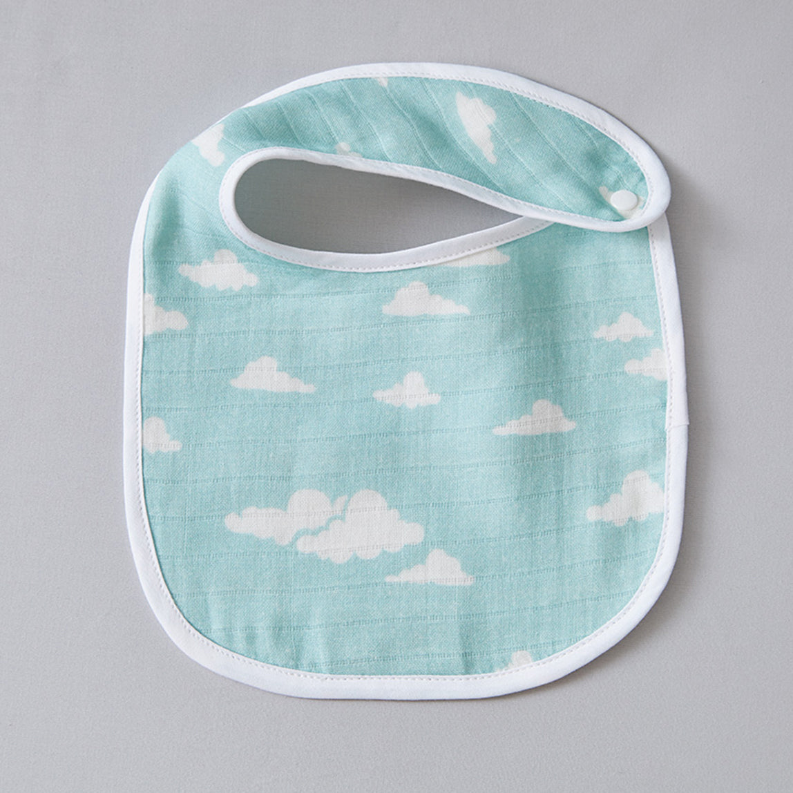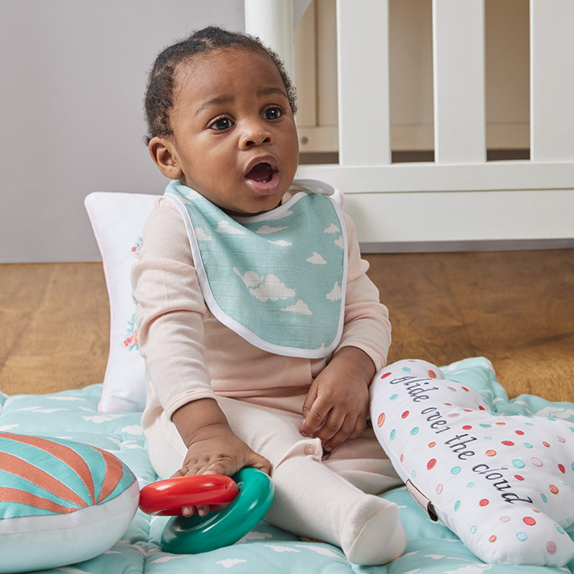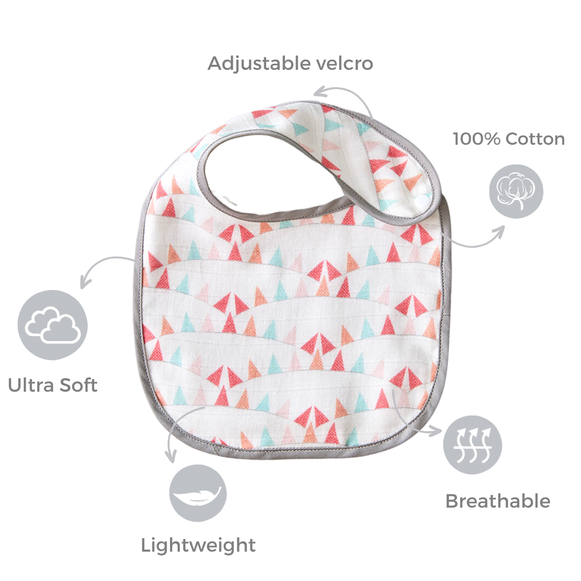 Light and airy muslin cotton bibs featuring hot air balloons, clouds, and colorful confetti dots. The adjustable velcro closure provides a secure fit, while the breathable fabric keeps little ones cool and comfy.