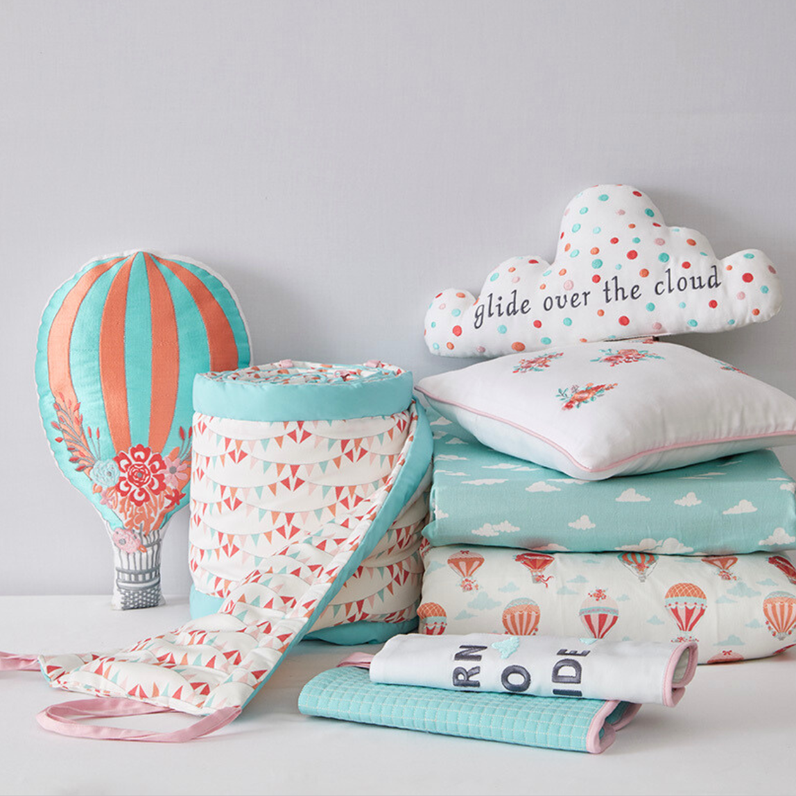Drift into dreamy skies with the Parachute Crib Set! Playful hot air balloons, soft cloud motifs, and a soothing pastel palette make this bedding set an enchanting addition to the nursery. Thoughtfully designed with a cozy comforter, breathable fitted sheet, plush cot bumpers, and cloud-shaped cushions, this set ensures a soft and snuggly sleep for little adventurers.