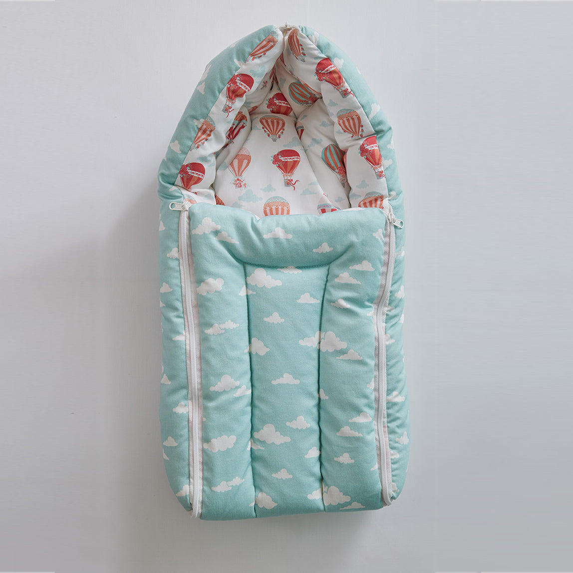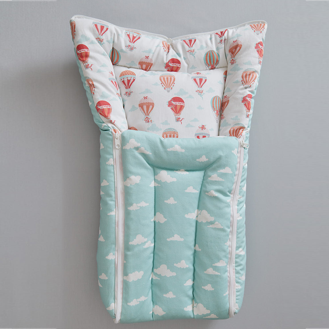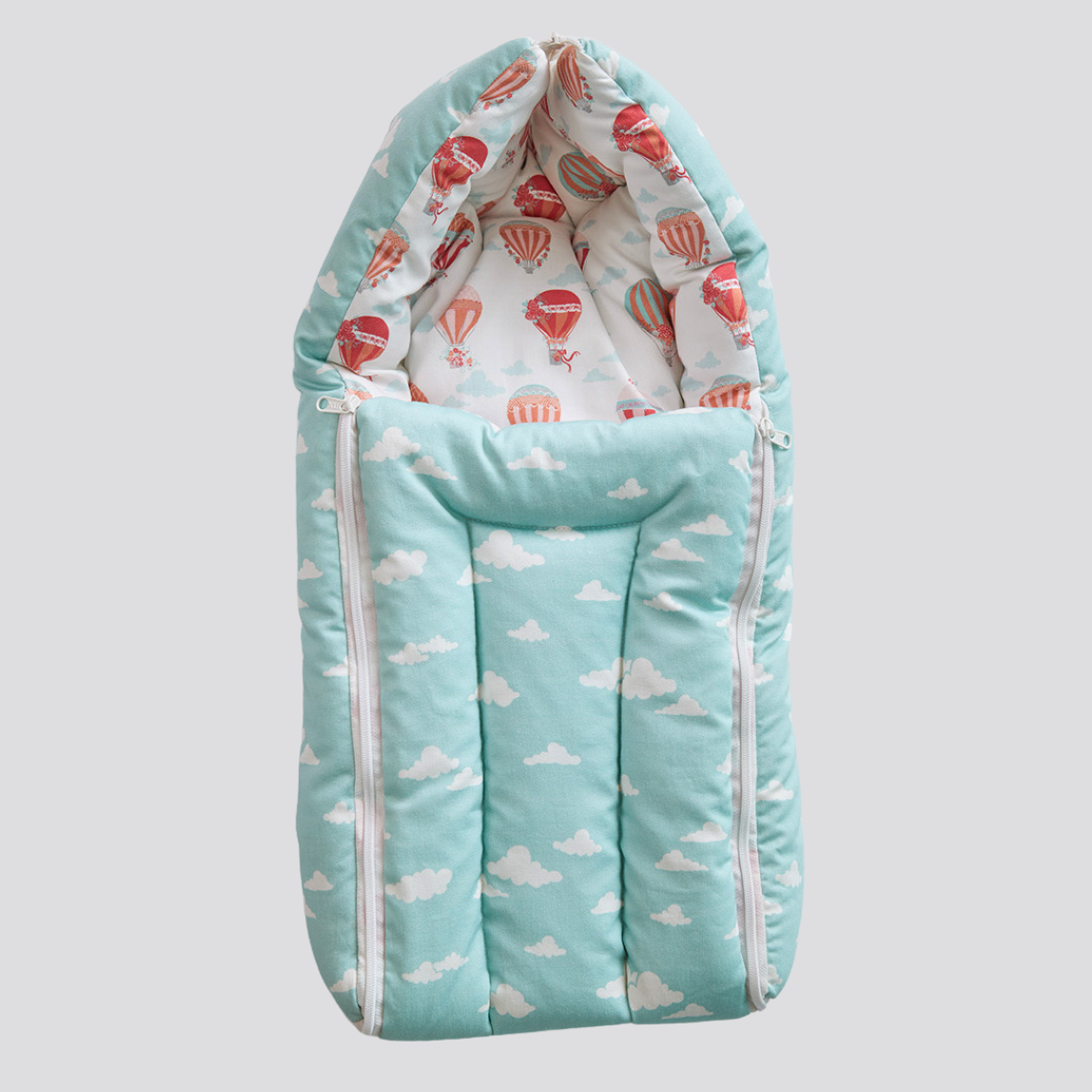 The Parachute Sleeping Bag wraps your baby in comfort with soft cotton fabric and whimsical balloon prints. A convenient side zipper allows for quick changes, while the breathable lining ensures a cozy, secure nap time.