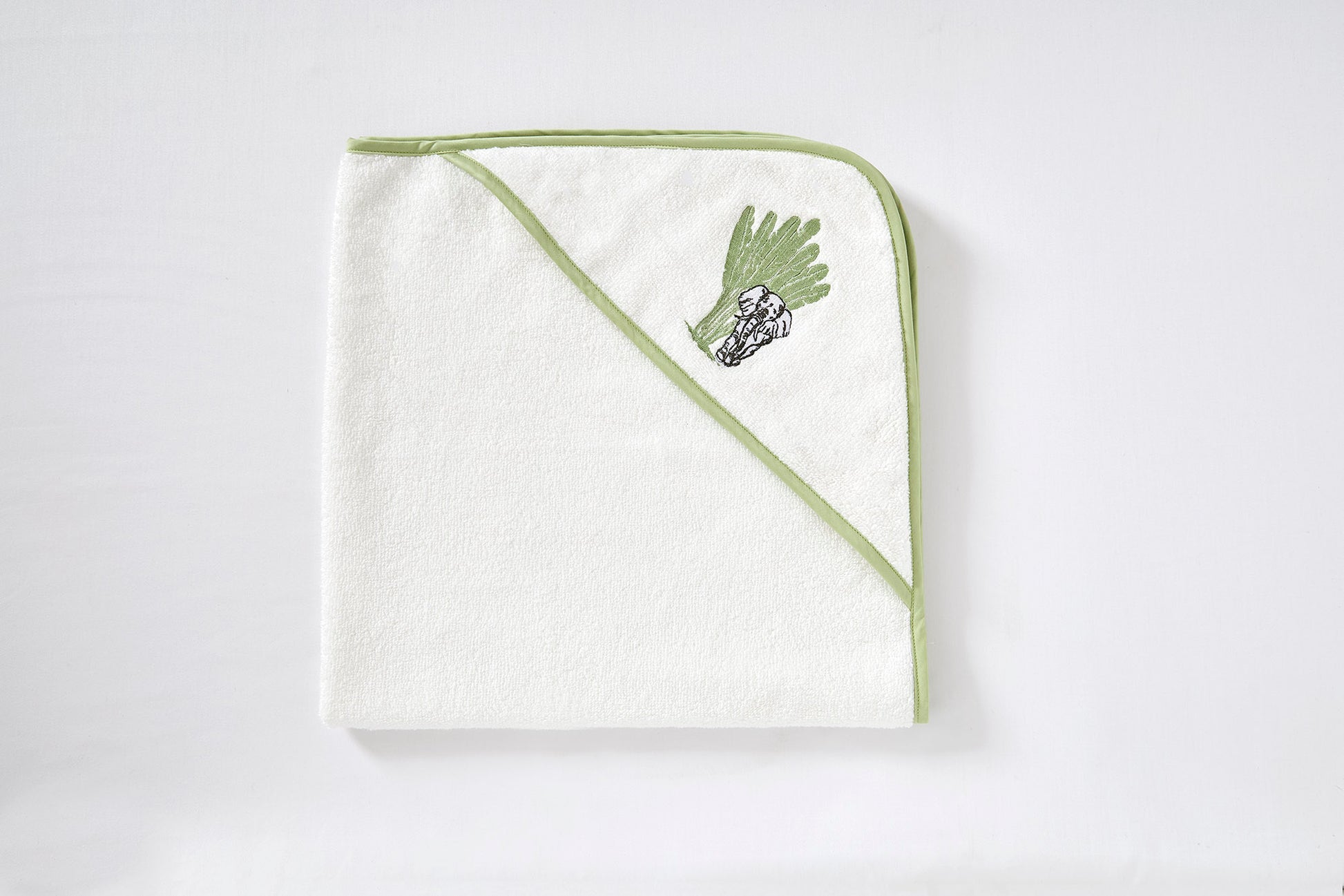 Embrace safari vibes with the Masai Hooded Towel. Made from zero-twist terry cotton, it features embroidered animals and a sage green border. The soft, absorbent fabric ensures a gentle drying experience after bath time.
