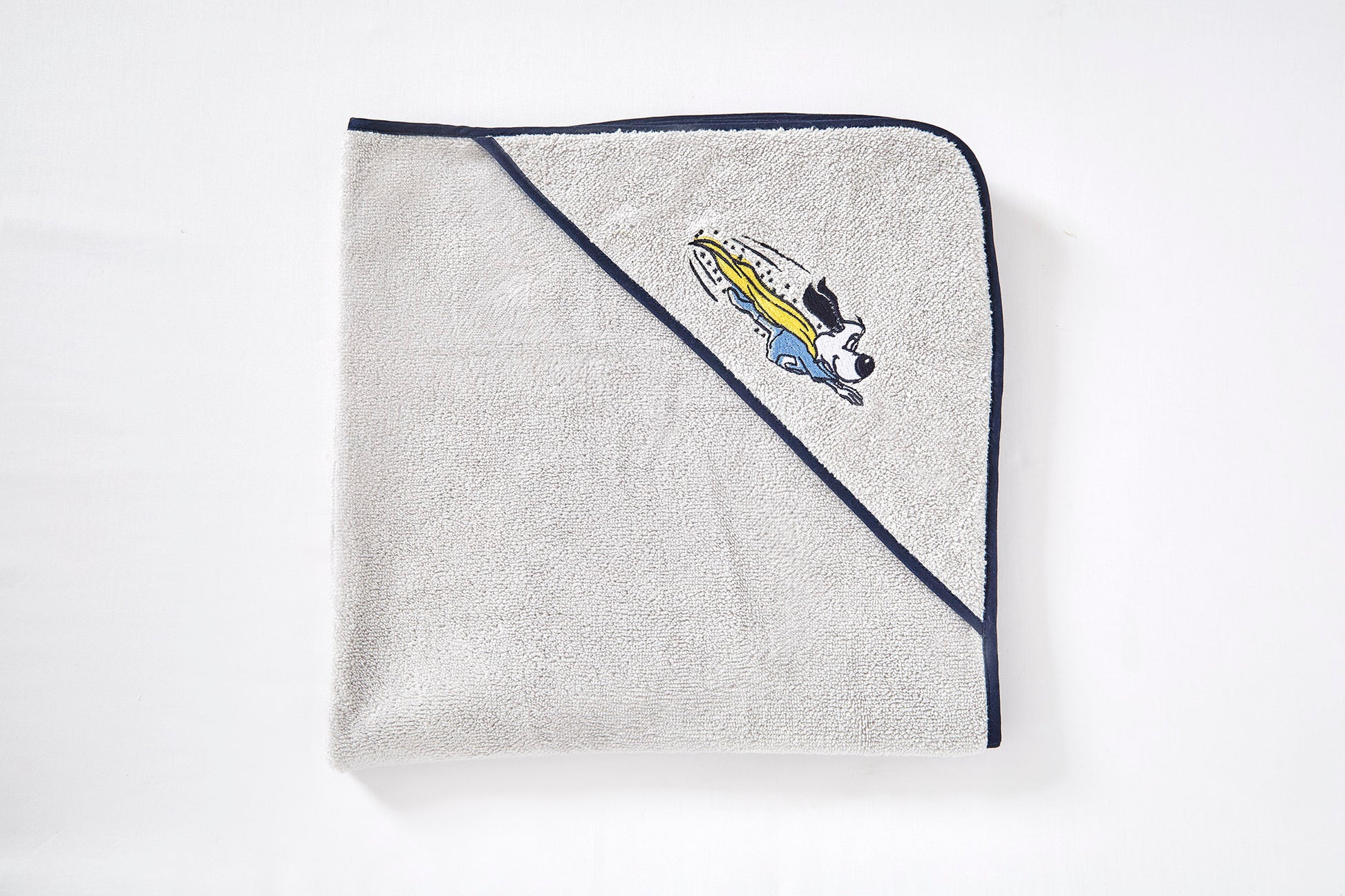 The Odyssey Hooded Towel, crafted from ultra-soft zero-twist terry cotton, features vibrant rocket embroidery. Its plush texture keeps little explorers warm and dry.