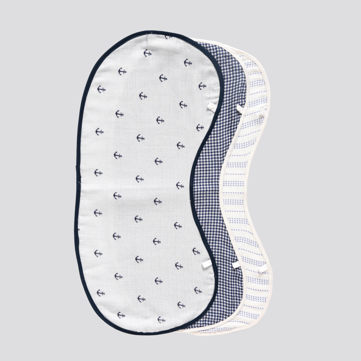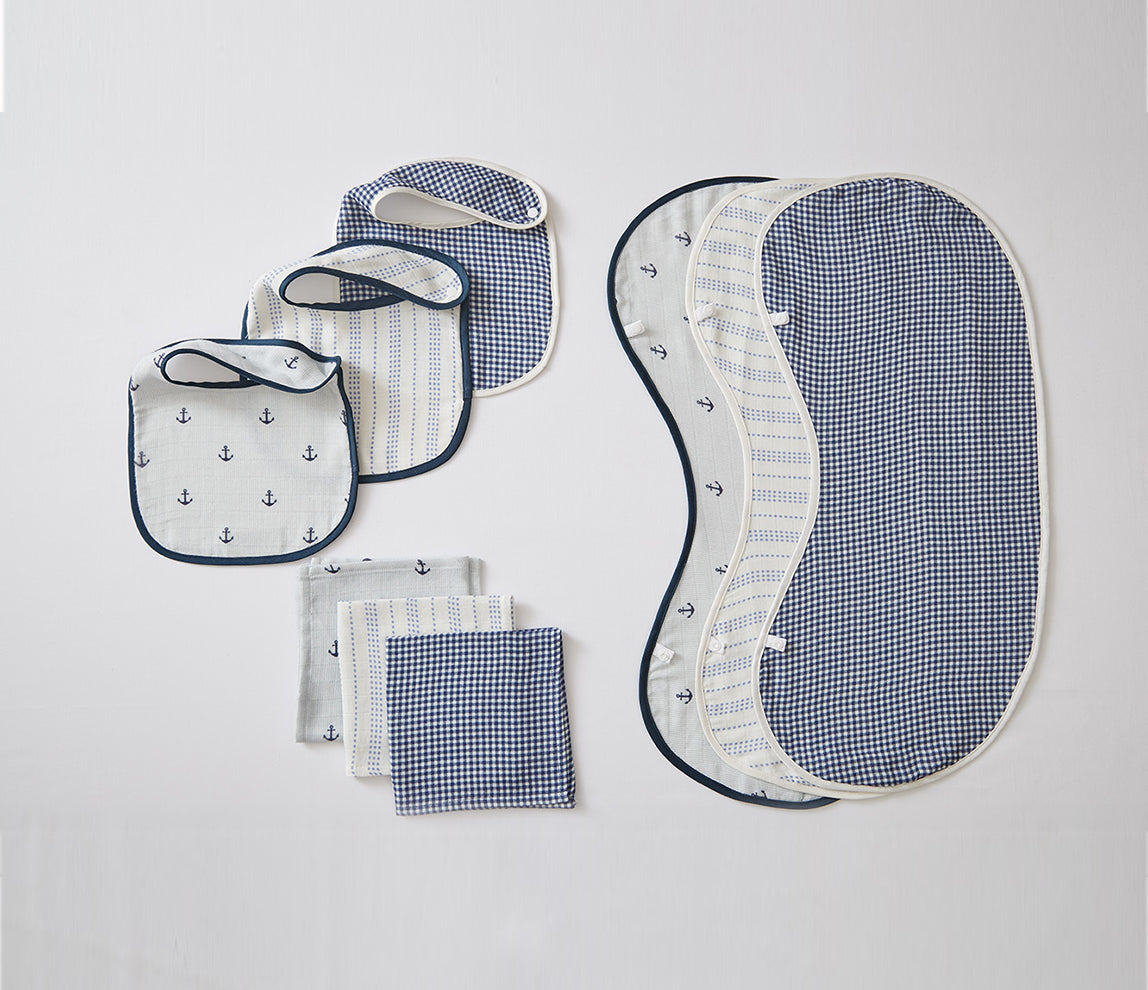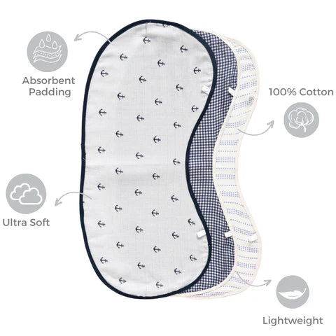 Crafted from ultra-soft muslin cotton, these burp cloths feature classic navy anchor prints, gingham checks, and subtle wave patterns. Absorbent and gentle on delicate skin, they're perfect for burping, spills, and clean-ups.