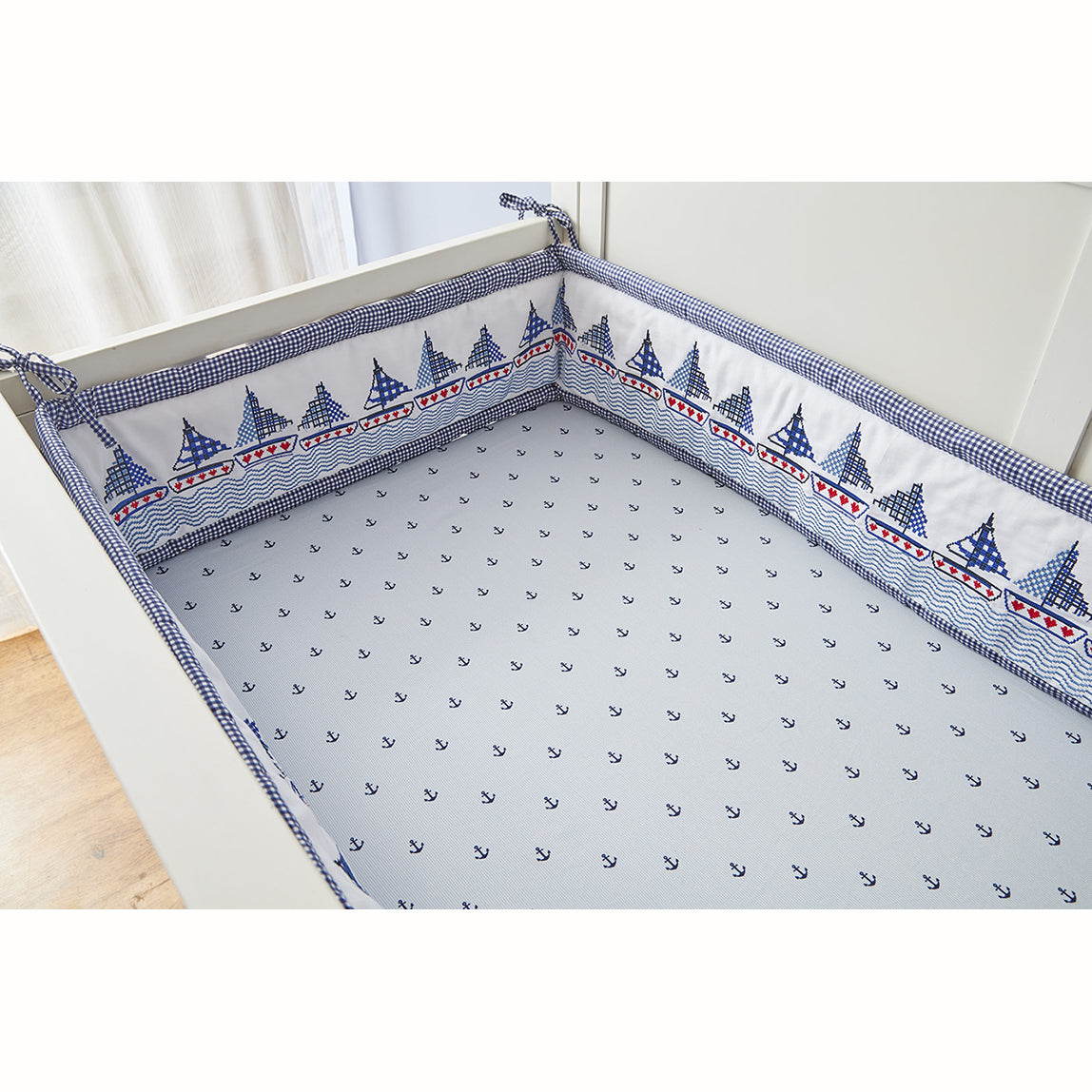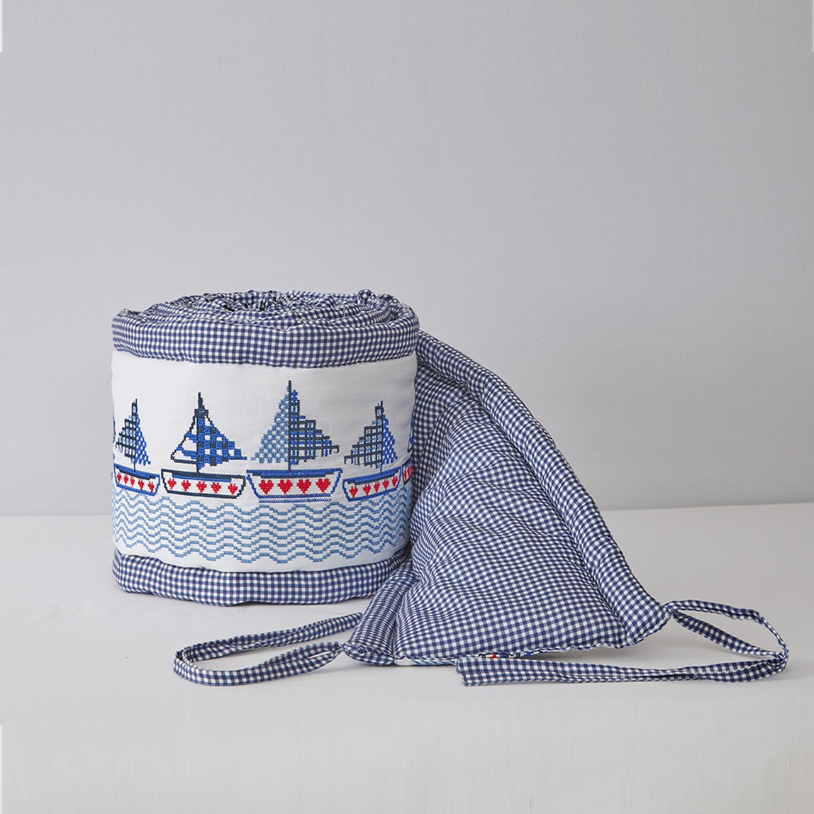 Add a nautical touch to the crib with the Sailboat Cot Bumper. Made from breathable cotton, it features delicate sailboat embroidery and classic checks. Padded for safety and comfort, with secure ties for a snug fit. The soft quilting and plush wadding create a protective, cushioned layer that keeps the crib cozy and safe.