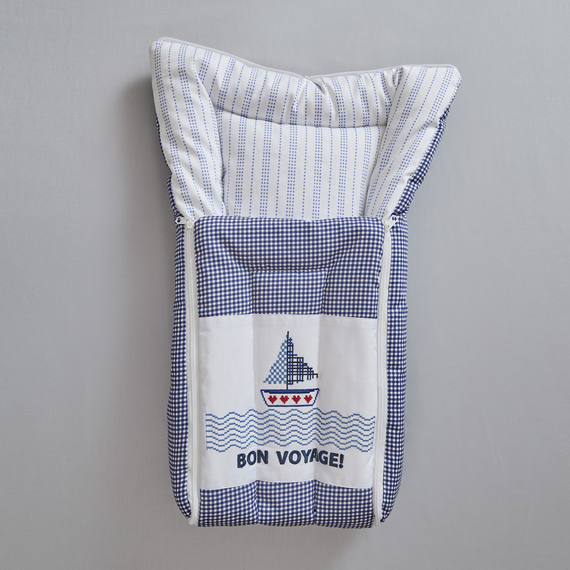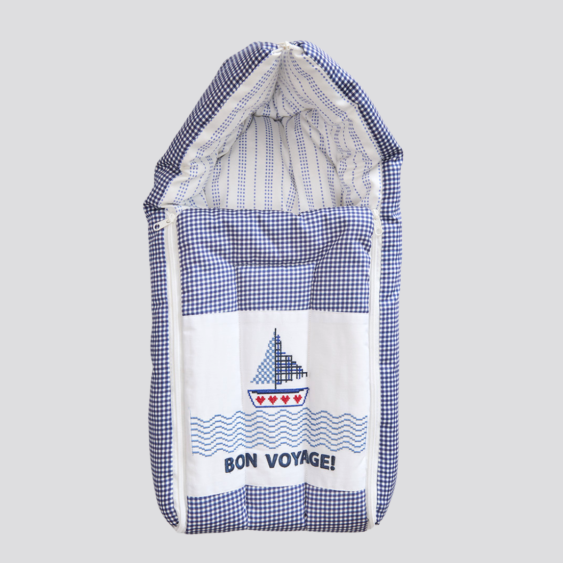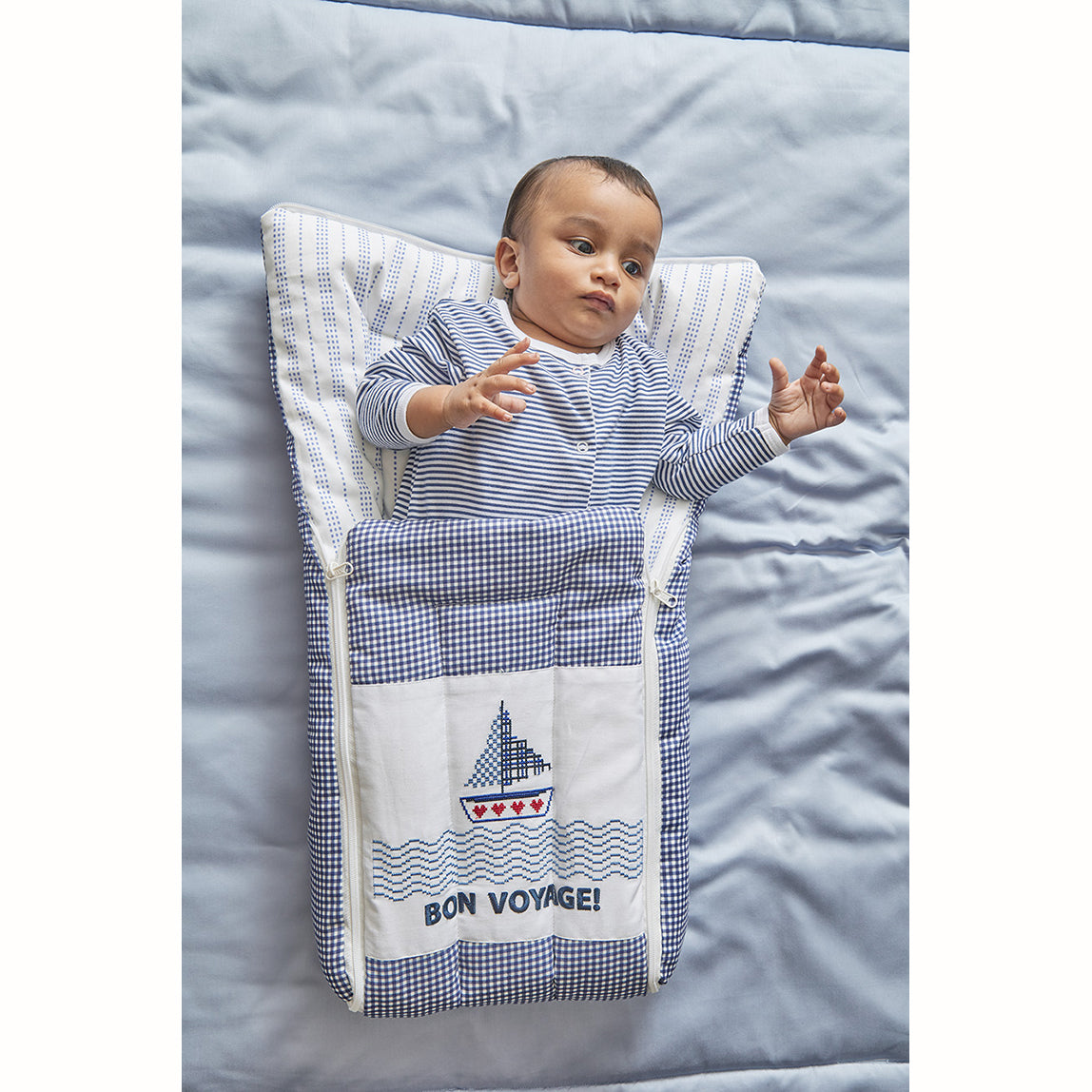 Featuring our signature blue-and-white sailboat print with delicate embroidery details, this sleeping bag fully unzips from top to bottom, including around the head, making it incredibly easy to slip your baby in or out without disturbing their sleep.