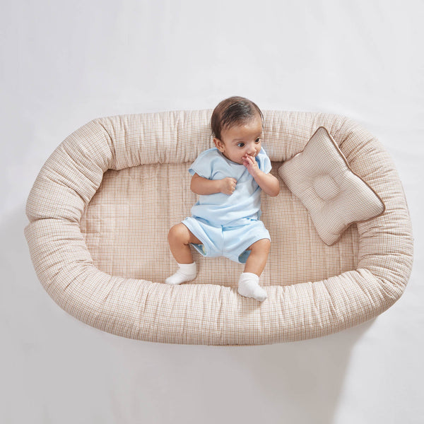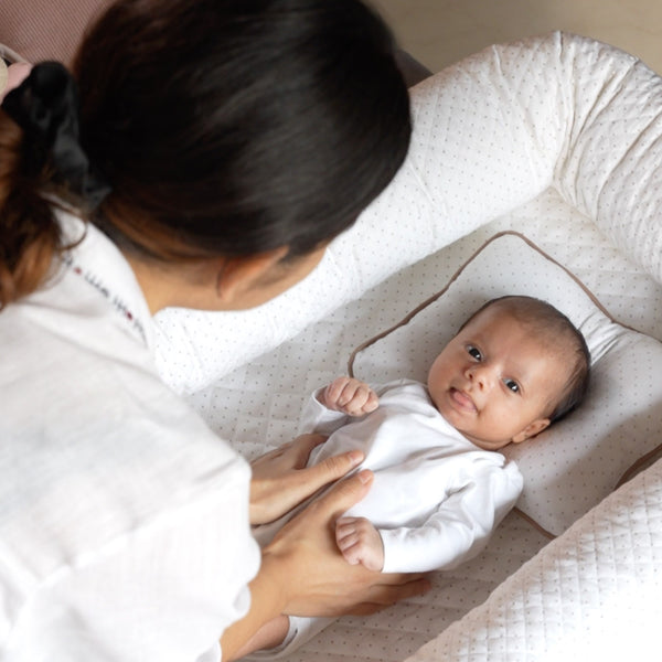 A timeless essential, this white quilted baby nest combines style and functionality. Crafted with premium cotton satin, its breathable fabric keeps your baby cool and cozy. The 1-inch thick mattress, surrounded by soft bolsters, provides a plush resting spot, while the secure buckle makes it easy to adjust. Ideal for both indoor and outdoor use, this nest is lightweight yet sturdy, ensuring convenience for parents on the go.